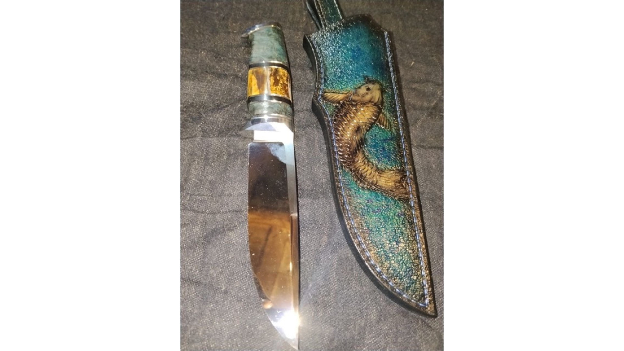 Піхви: Натуральна теляча шкіра чепрак рослинного вичинки та дублення 4.0 мм, оброблена апретурою для захисту від води та просякнута захисними розчинами, прошита вручну вощеною ниткою, ручне тиснення фактури малюнка. Вільний підвіс на пасок (відомого майстра ручної роботи зі шкірою - Олег Михайловський). Вільний підвіс