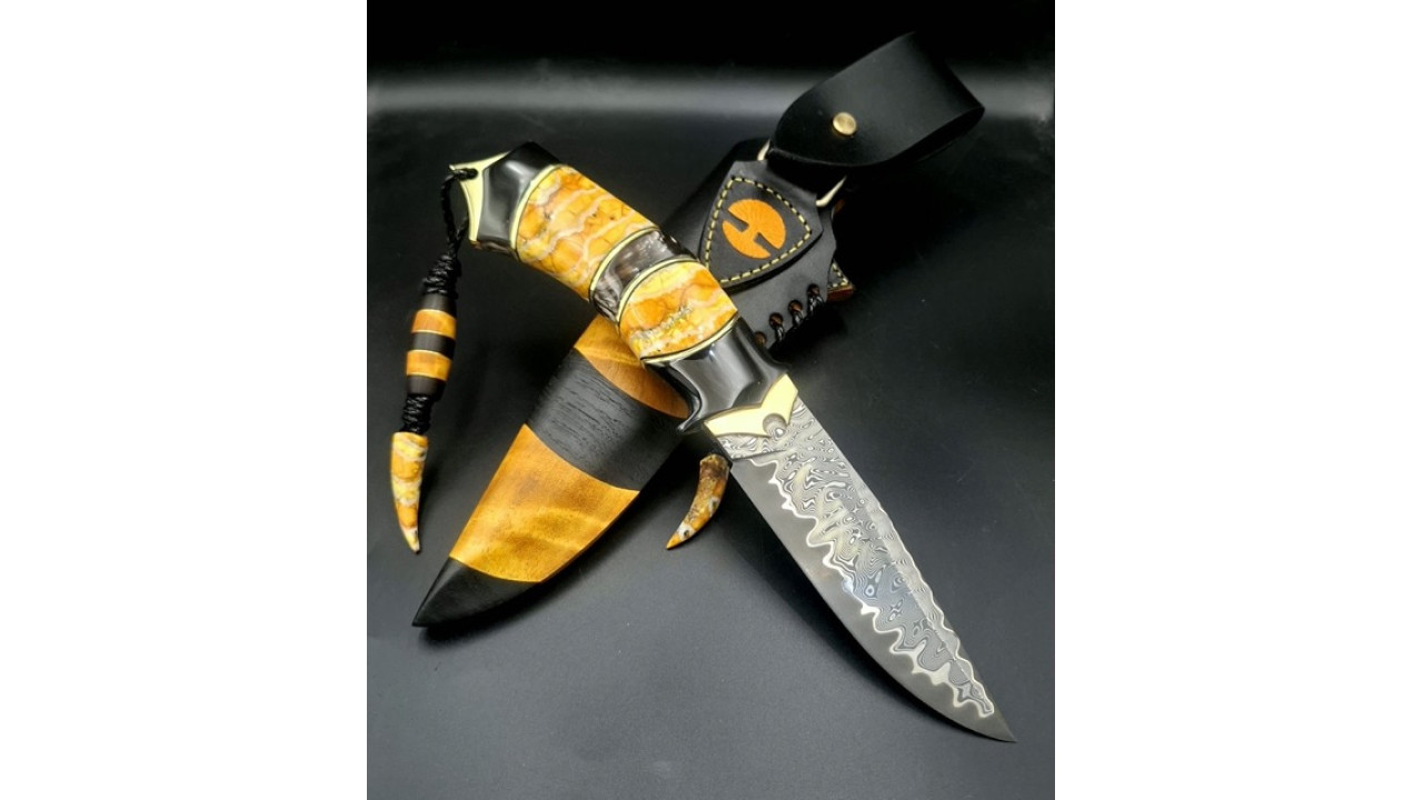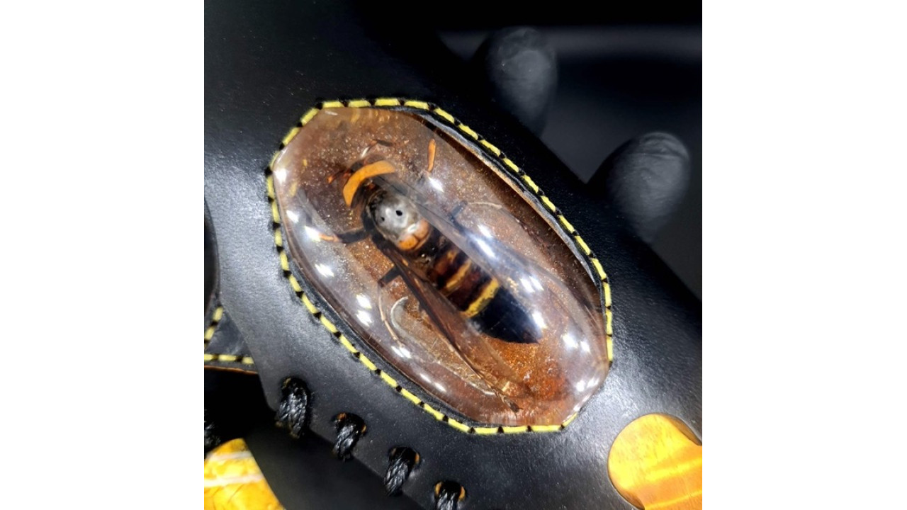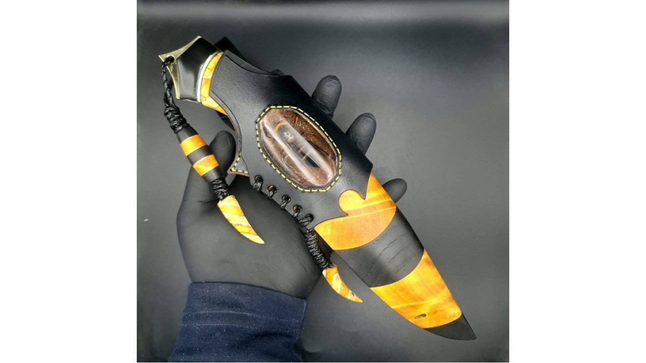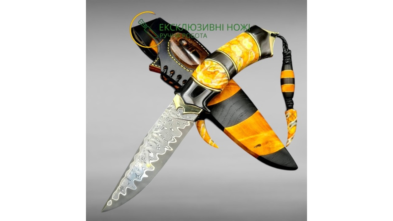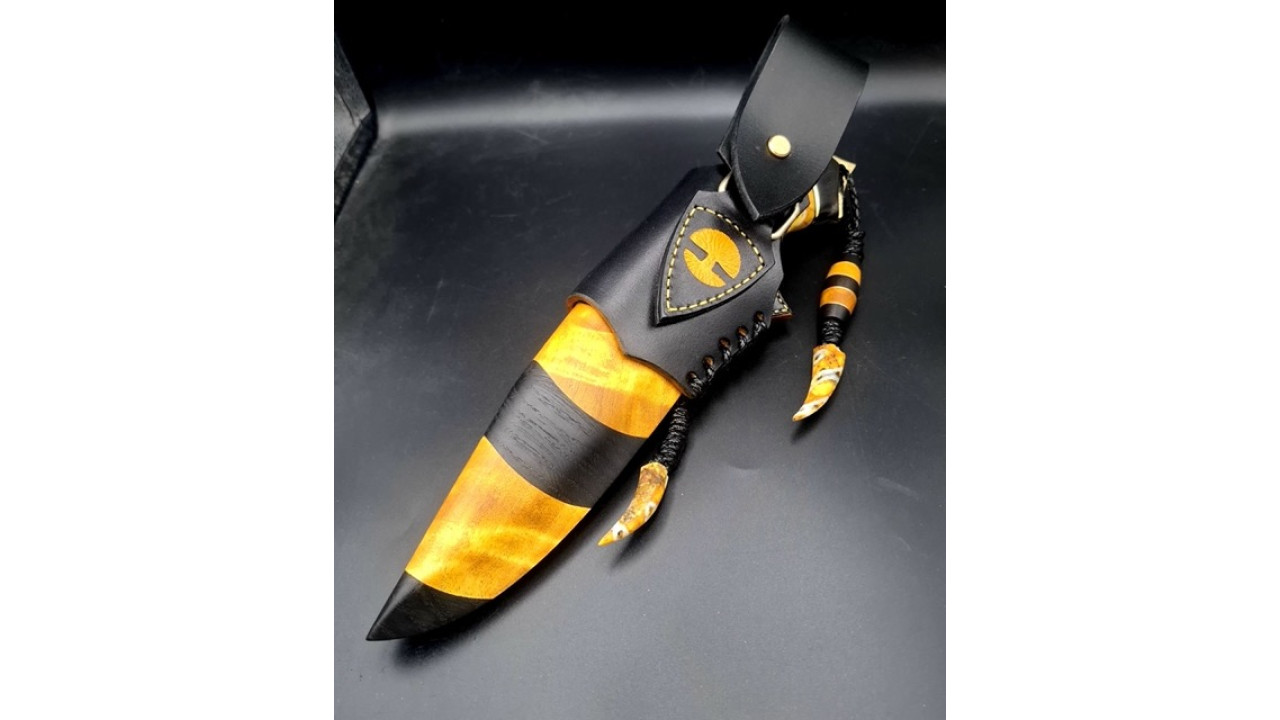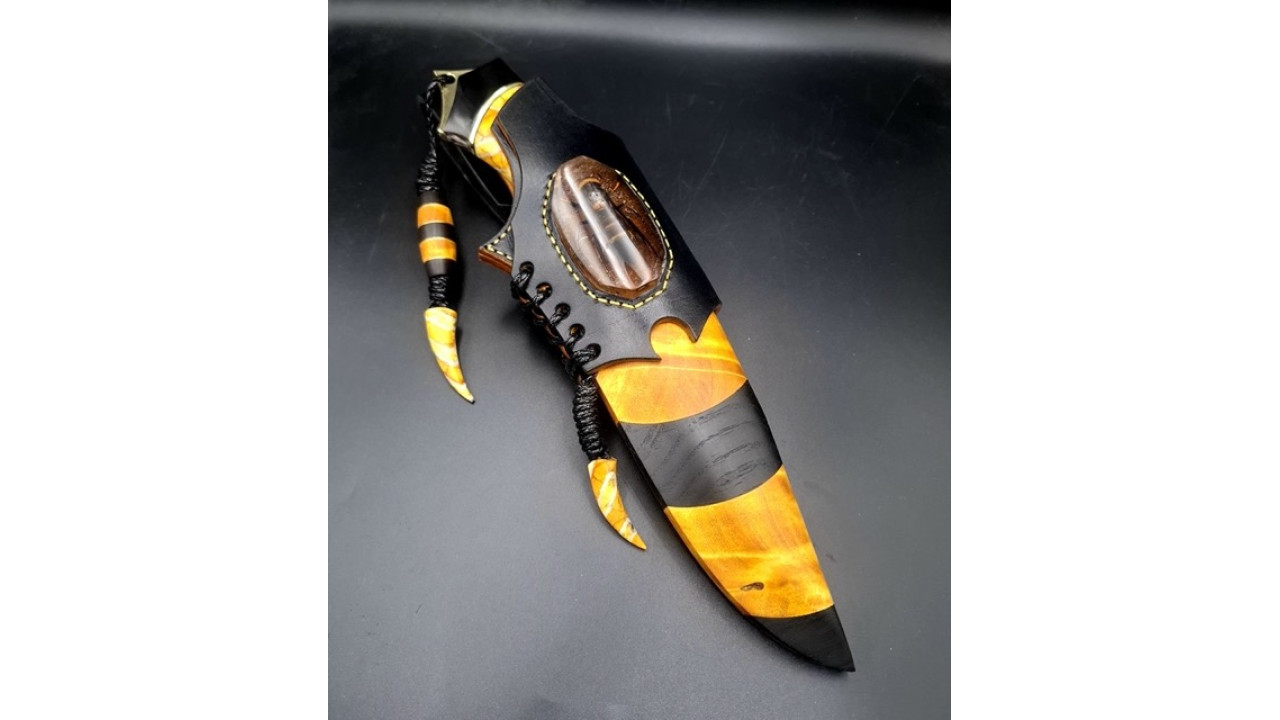 Піхви: Сувіль берези, морений дуб, італійська натуральна шкіра рослинного дублення, оброблена апретурою для захисту від води та просякнута захисними розчинами, прошита вощеною ниткою. Ручне тиснення фактури. Вставка на ножнах - вставка- азійський шершень в акрилі. Підвіс вільний, з'ємний