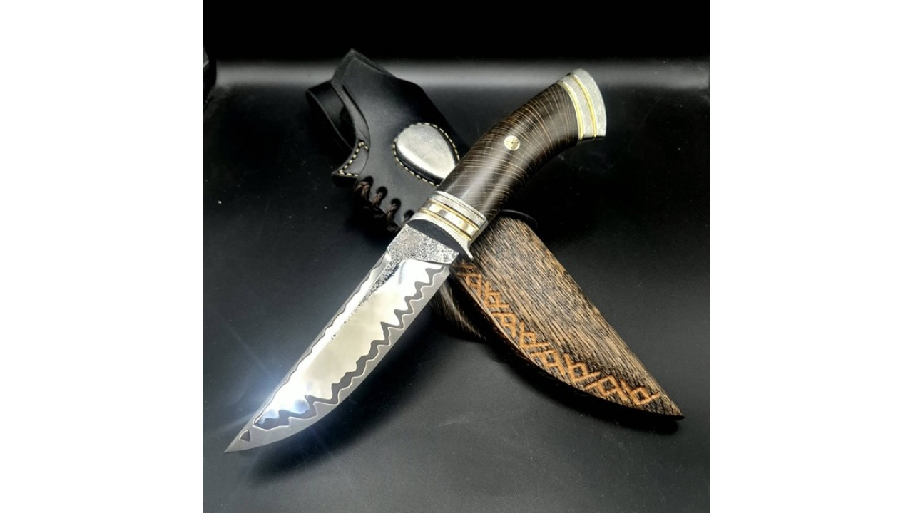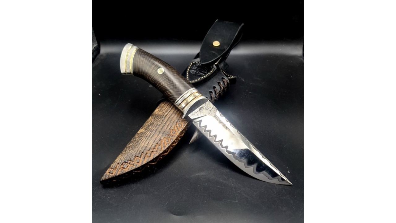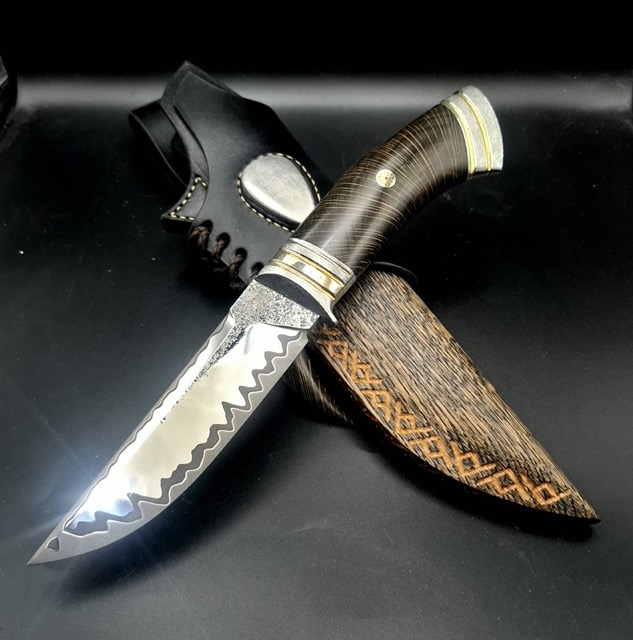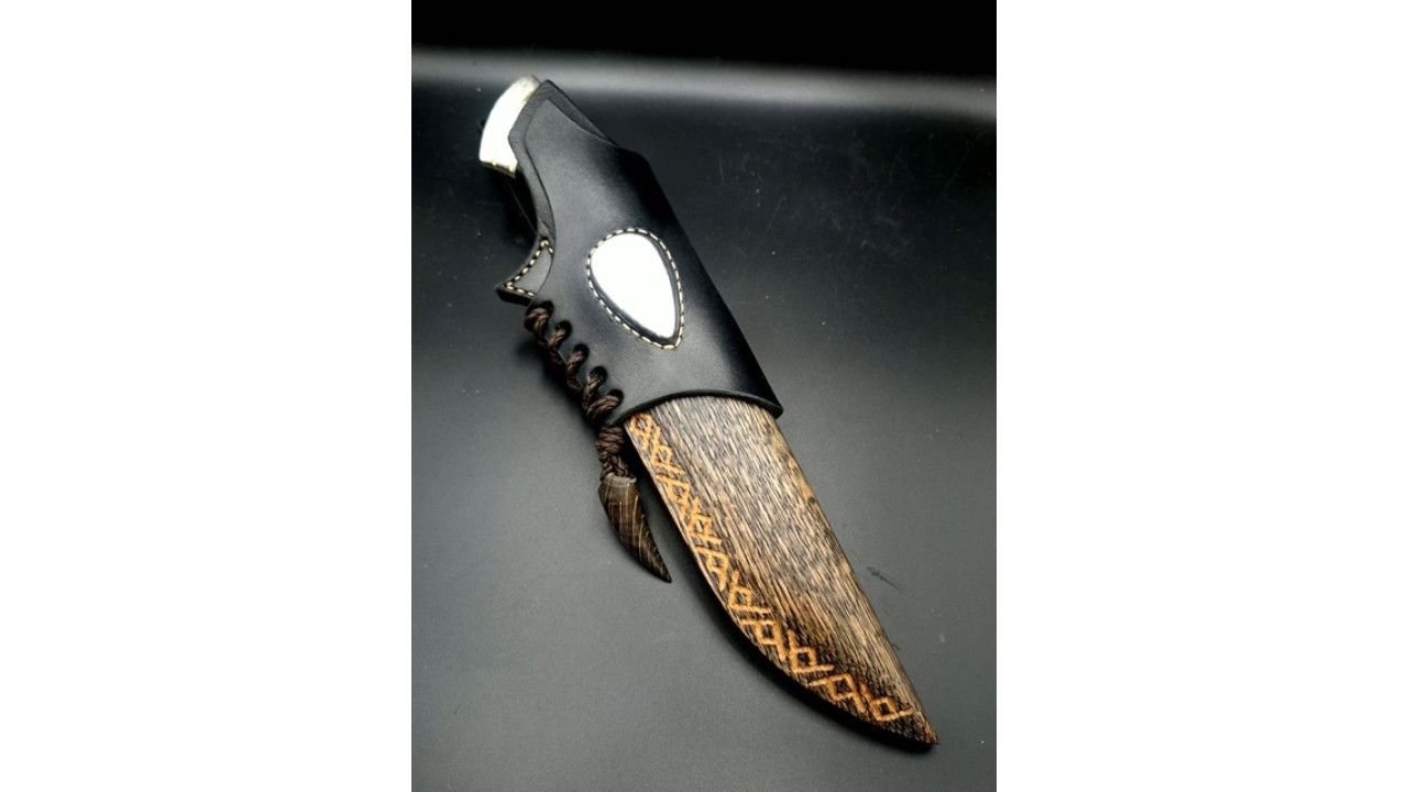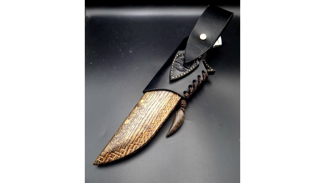 Піхви: Дуб, різьблення по дереву, шкіра хромового дублення, оброблена апретурою для захисту від води та просякнута захисними розчинами, прошита вощеною ниткою. Ручне тиснення фактури. Вільний підвіс, з'ємний. Вставка на ножнах - з нержавійки, Бусина зі стабілізованого дуба