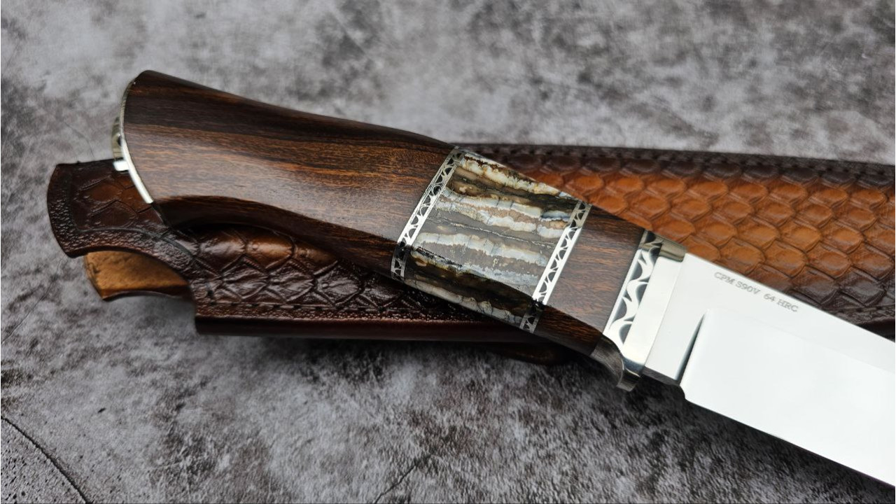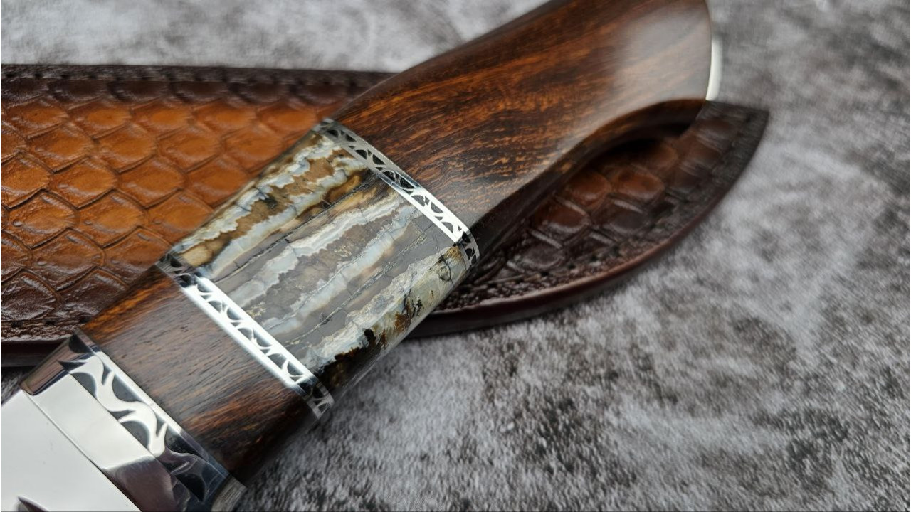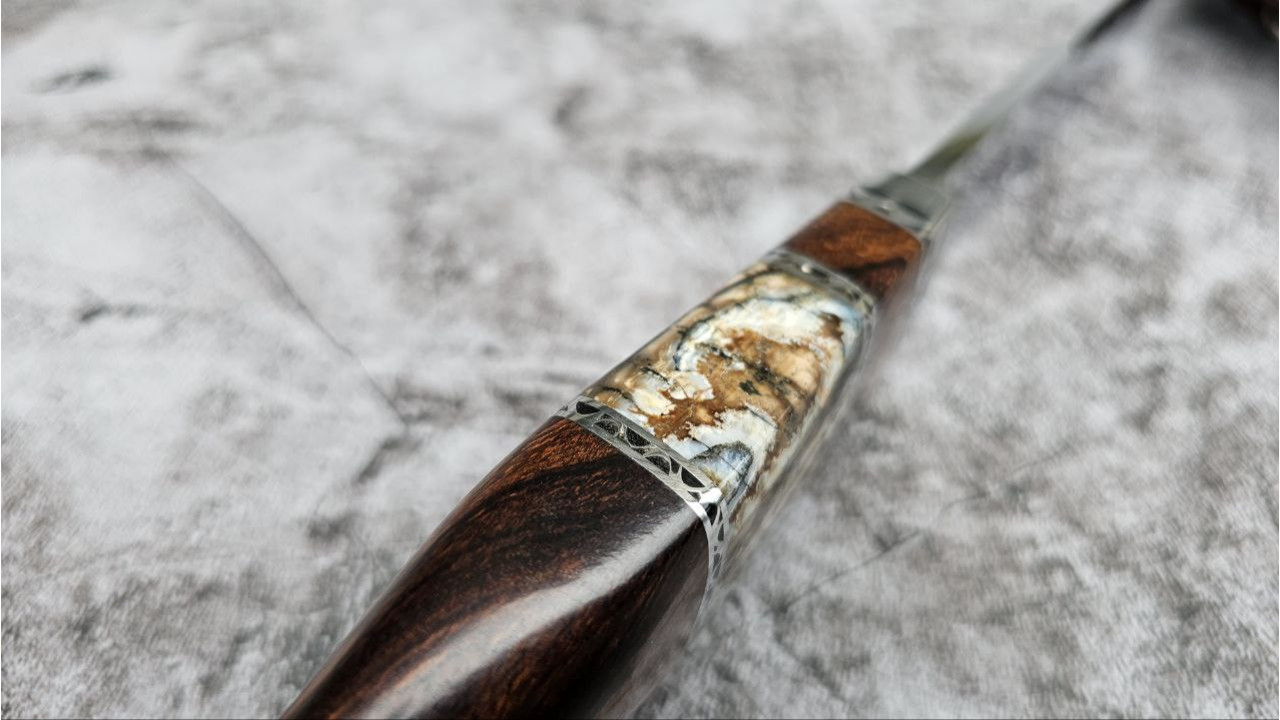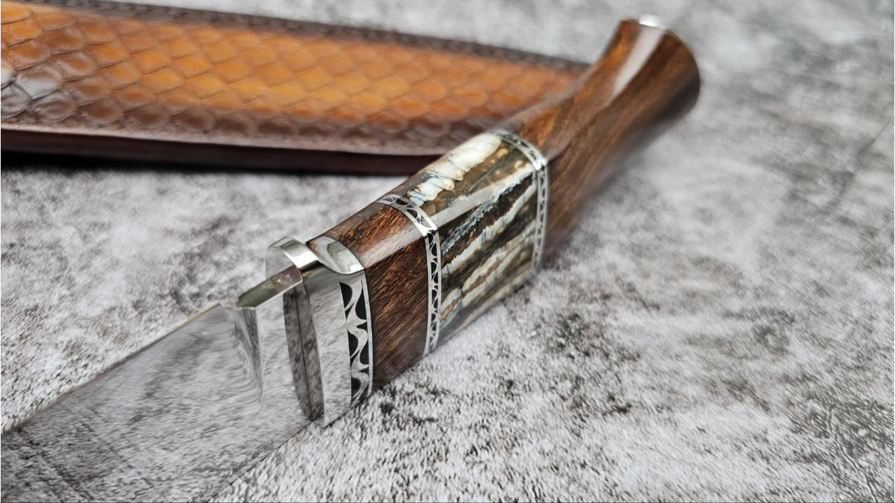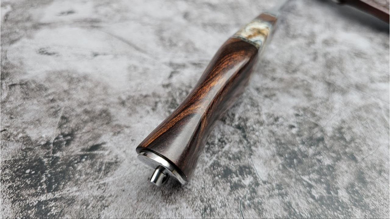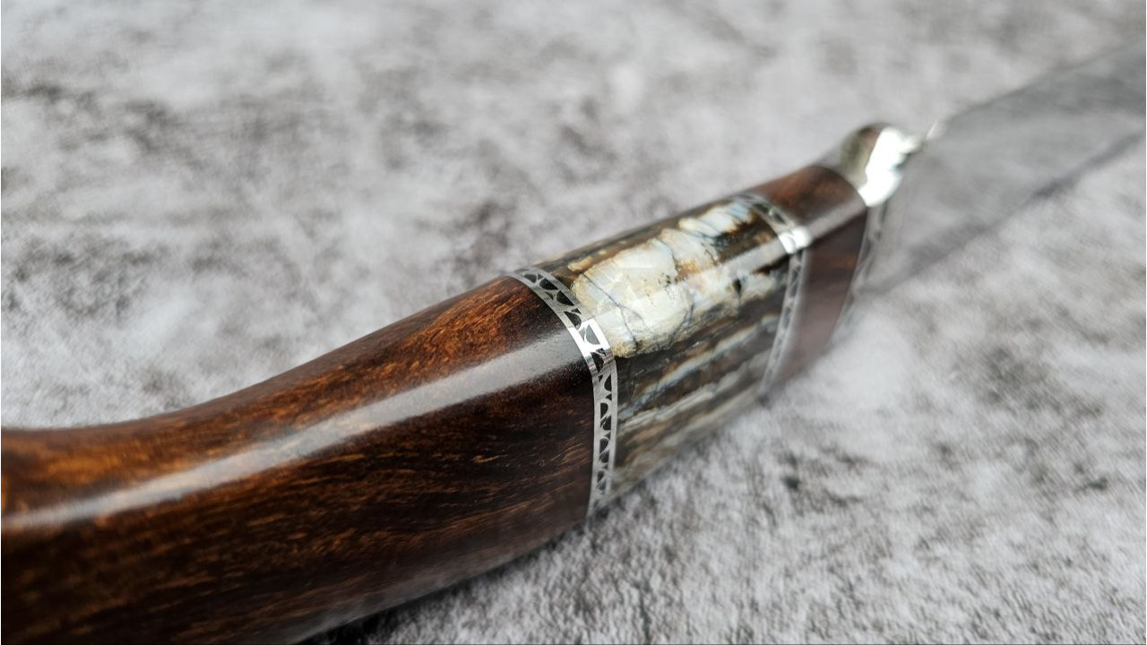 Матеріал руків'я: Нержавіюча сталь, айронвуд (Ironwood), вставка із стабілізованого зуба мамонта, металеві проставки з нержавіючої сталі