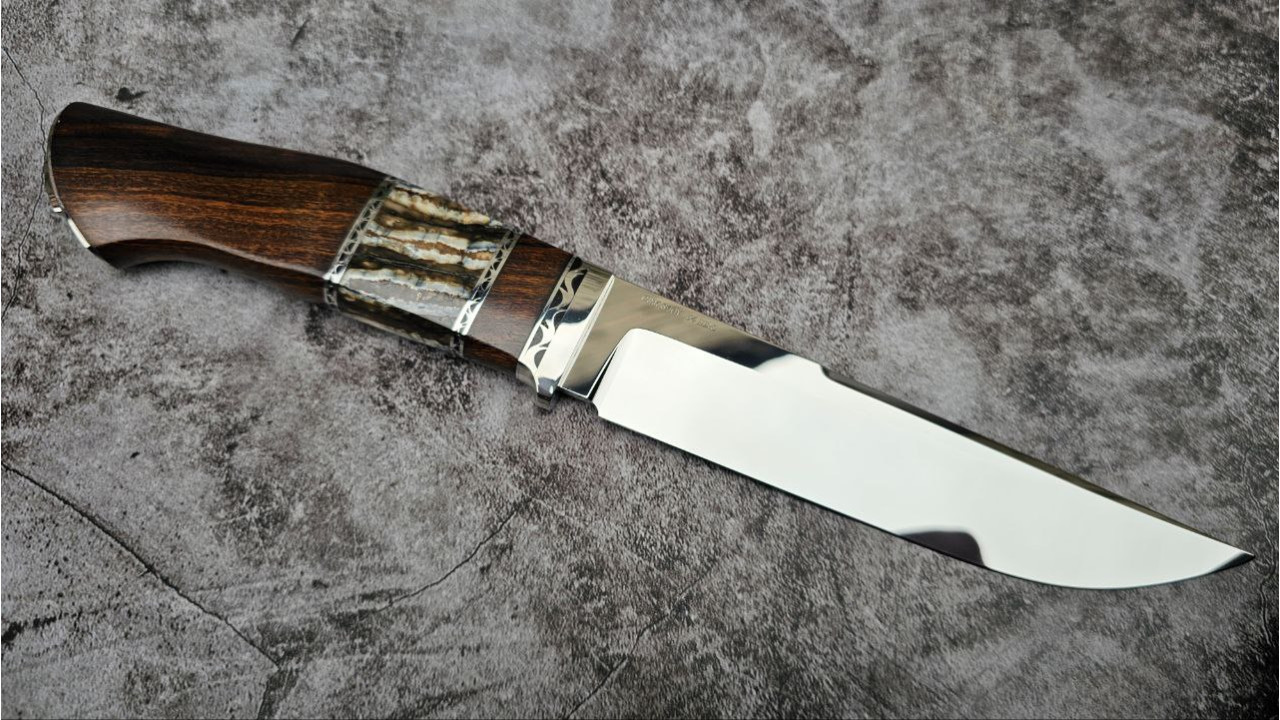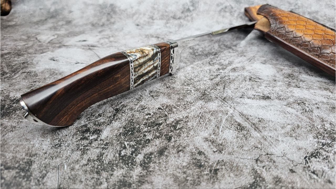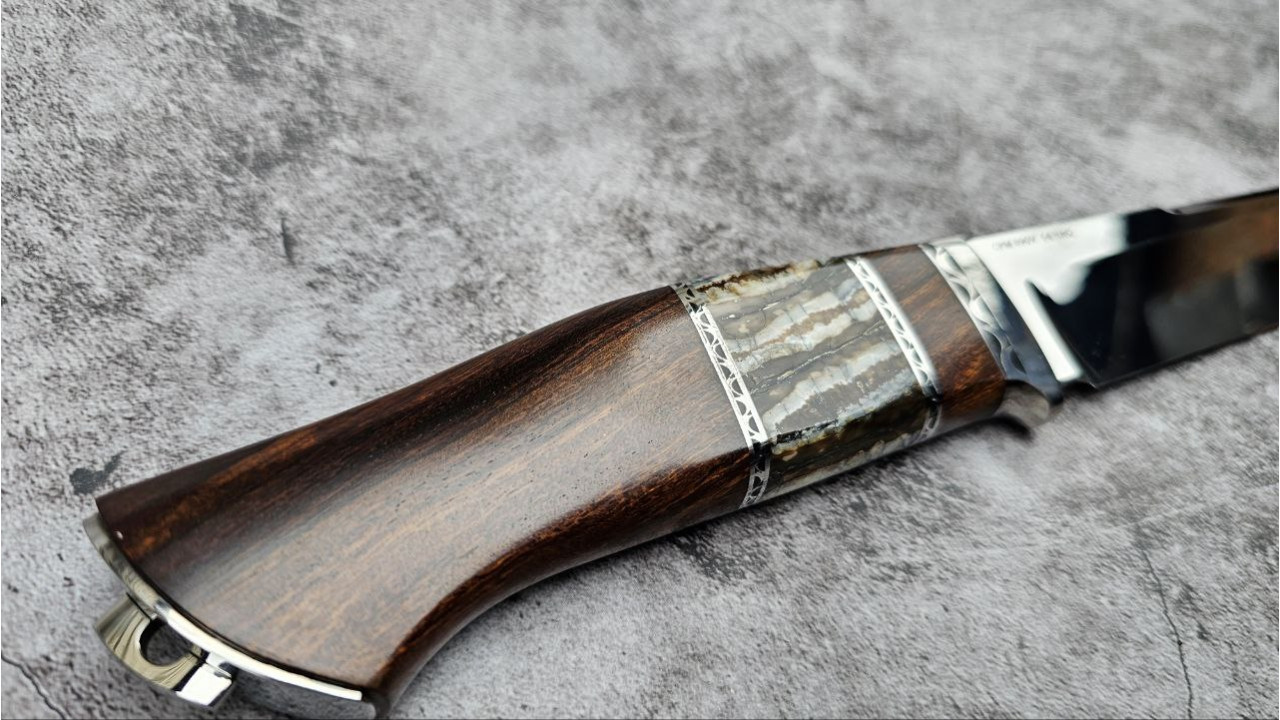 | Матеріал руків'я: | Нержавіюча сталь, айронвуд (Ironwood), вставка із стабілізованого зуба мамонта, металеві проставки з нержавіючої сталі |