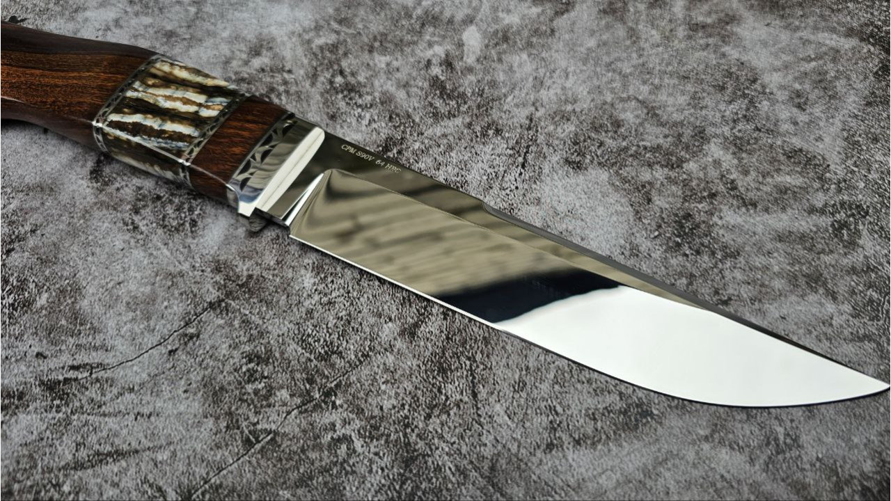 Сталь марки CPM S90V – нержавіюча інструментальна порошкова сталь виробництва США. Вперше представлена 1999 року компанією Crucible Industries. Непогана, досить міцна та зносостійка сталь з твердістю 56-59 HRC. Вміст карбідів близько 22% (див. нижче). Основою для неї послужила 420 сталь із додаванням великої кількості ванадію та збільшенням рівня вуглецю. Про ріжучі властивості CPM S90V ходить суперечлива інформація – хтось (напевно продавці) хвалять, а хтось каже, що з такою твердістю можна подивитися і на простіші сталі. Тут сперечатися не буду - подивитися завжди можна, але CPM S90V пропонує суттєве покращення зносостійкості, порівняно з більш простими 440C і D2, при корозійній стійкості, що дорівнює або краща, ніж у 440C. Високий вміст ванадію в S90V сприяє утворенню твердіших, порівняно з карбідами хрому, ванадію карбідів, залишаючи більше вільного хрому для забезпечення корозійної стійкості. У заточенні CPM S90V є сенс віддати перевагу алмазам, ельборам або каменям з карбіду кремнію. При використанні природного точильного каміння на фініші я б подивився в сторони не надто твердого каміння.
