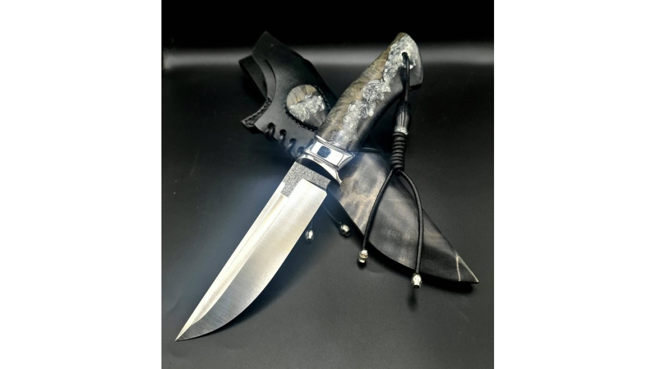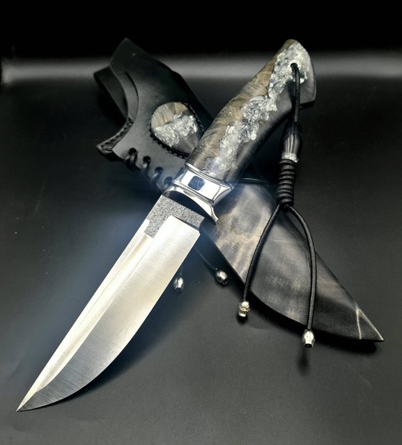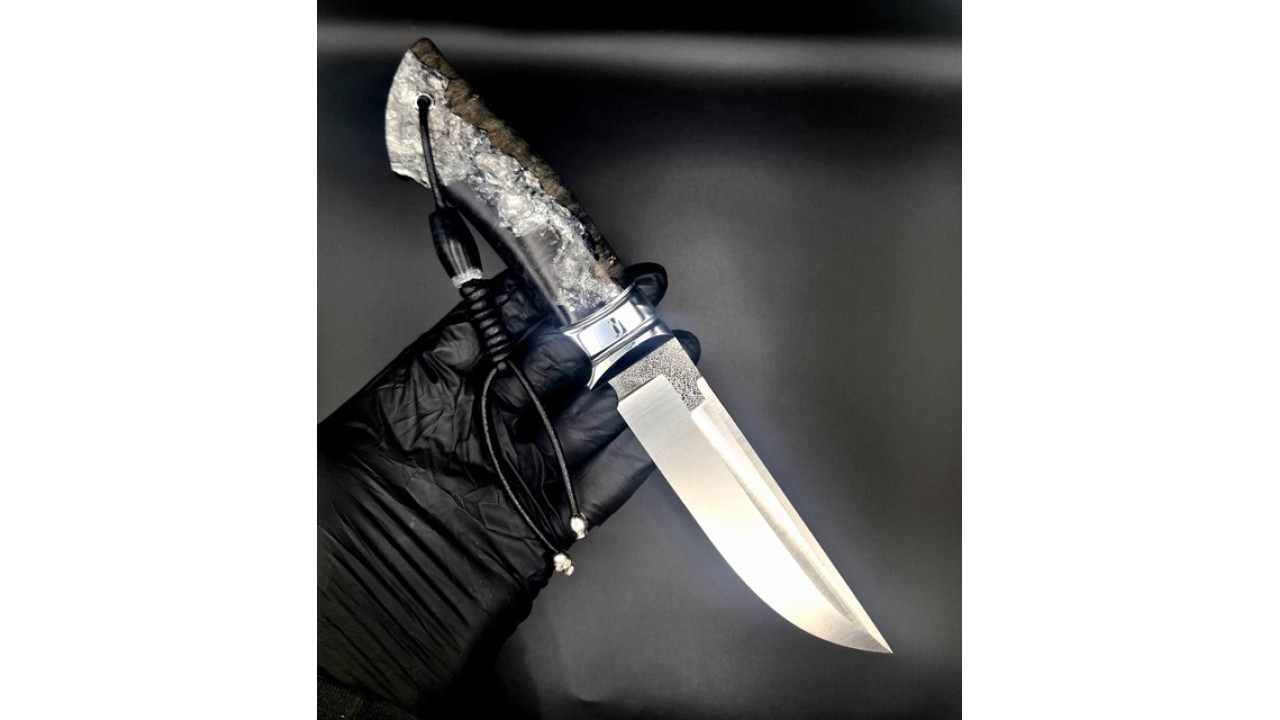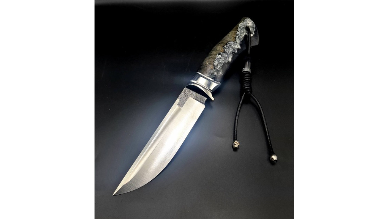 Матеріал руків'я: Нержавіюча сталь, g10, гібрид зі стабілізованого капу клену і акрилу з поталлю, мозаічний пін, мозаічна темлячна трубка. Бусини з гібриду.