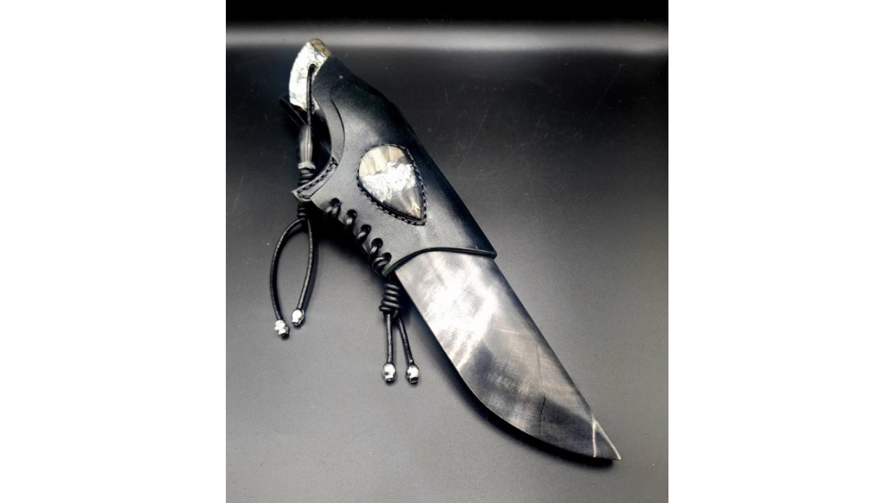 Піхви: Сувіль берези, різьблення по дереву (скандинавська вязь). Натуральна теляча шкіра чепрак (Італія) 4.0 мм, оброблена аппретурою для захисту від води та просочена захисними розчинами, жировоскове просочення, прошита вощеною ниткою. Ручне тиснення фактури. Підвіс з'ємний, вставка з гібриду