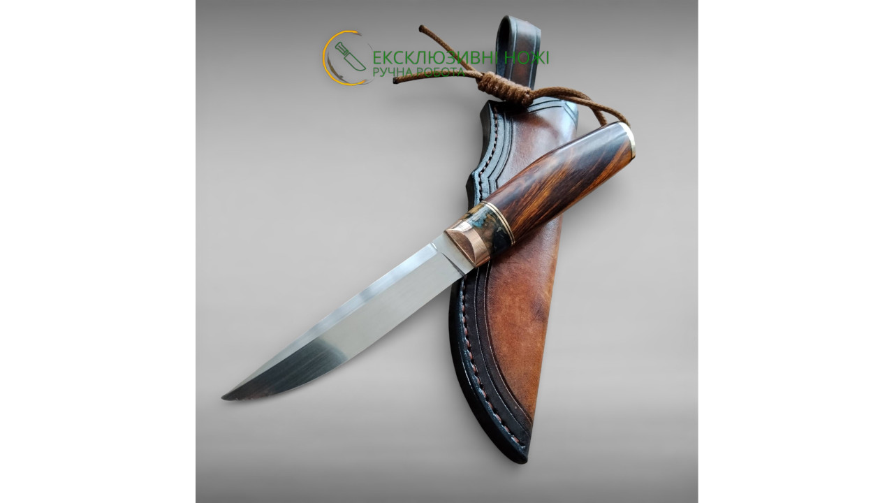 | Матеріал руків'я: | Больстер і тильник нержавійка Aisi 304. Стабілізований кап клена, проставка зуб мамонта, стабілізований чорний граб |