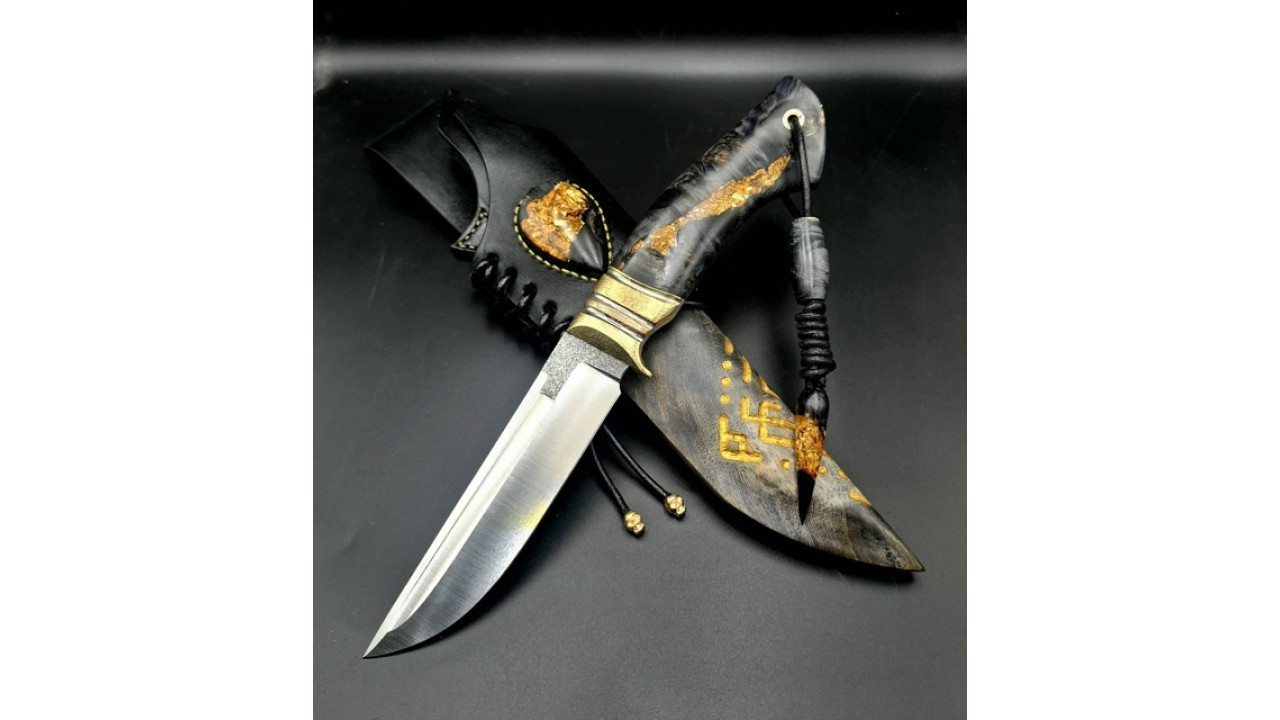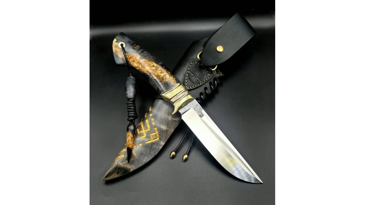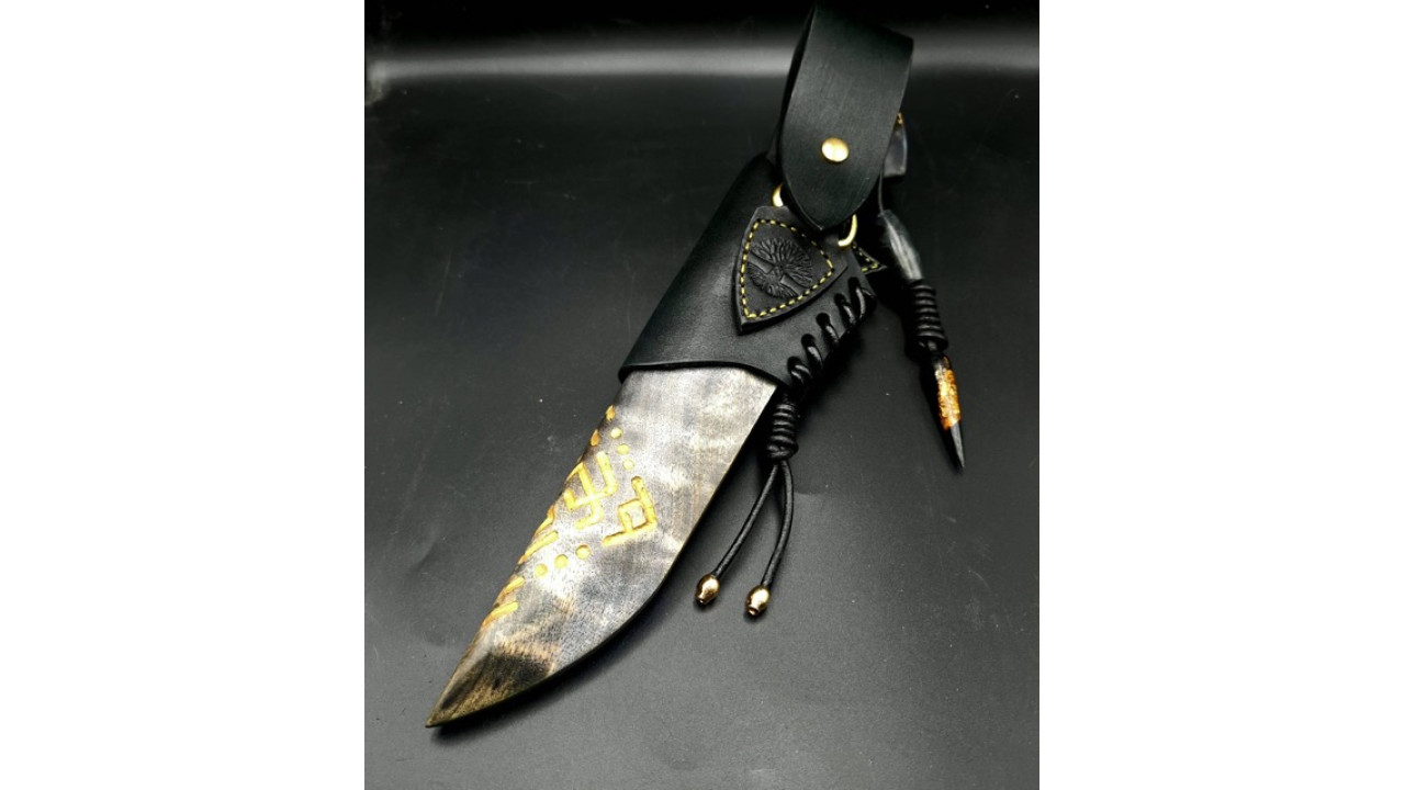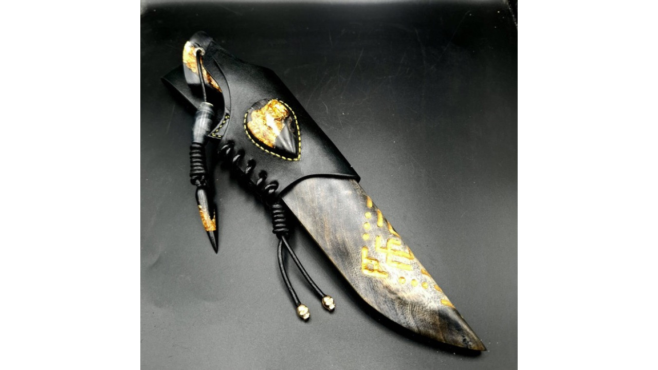 Піхви: Сувіль берези, різьблення по дереву (скандинавська вязь). Натуральна теляча шкіра чепрак (Італія) 4.0 мм, оброблена аппретурою для захисту від води та просочена захисними розчинами, жировоскове просочення, прошита вощеною ниткою. Ручне тиснення фактури. Підвіс з'ємний, вставка з гібриду