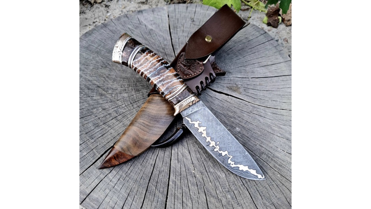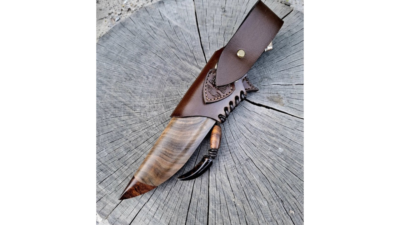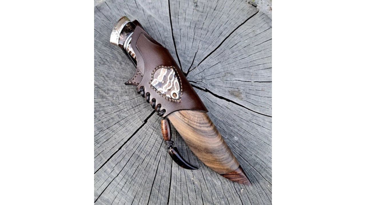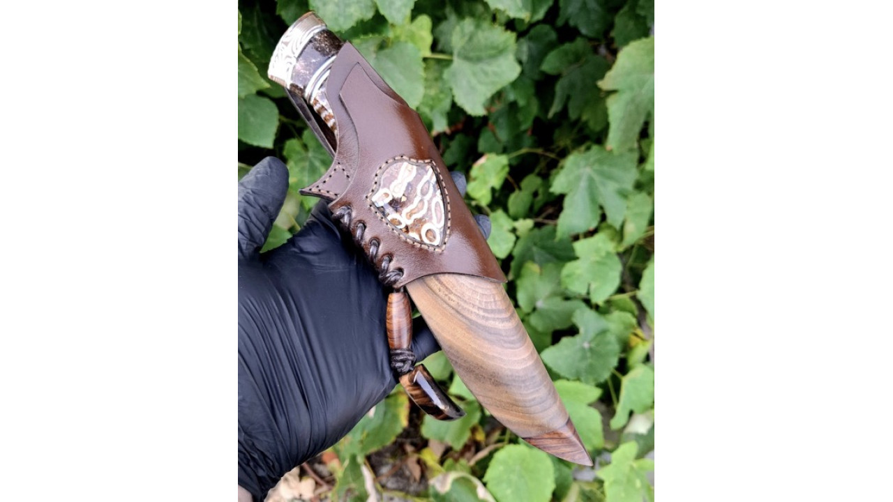 Піхви: Горіх і айронвуд. Натуральна теляча шкіра чепрак 4.0 мм, оброблена аппретурою для захисту від води та просочена захисними розчинами, жировоскове просочення, прошита вощеною ниткою. Ручне тиснення фактури. Підвіс з'ємний, вставка на ножнах зі стабілізованого зуба мамонта.