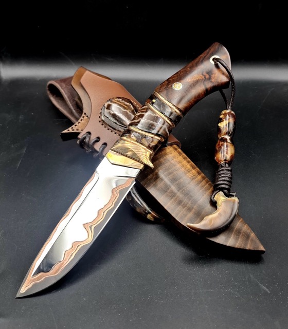 | Матеріал руків'я: | Макуме-гане, мідь, латунь, бурштин в акрилі, стабілізований зуб мамонта, унікальна за своєю рідкістю деревина - сувіль айронвуда, мозаічні піни |