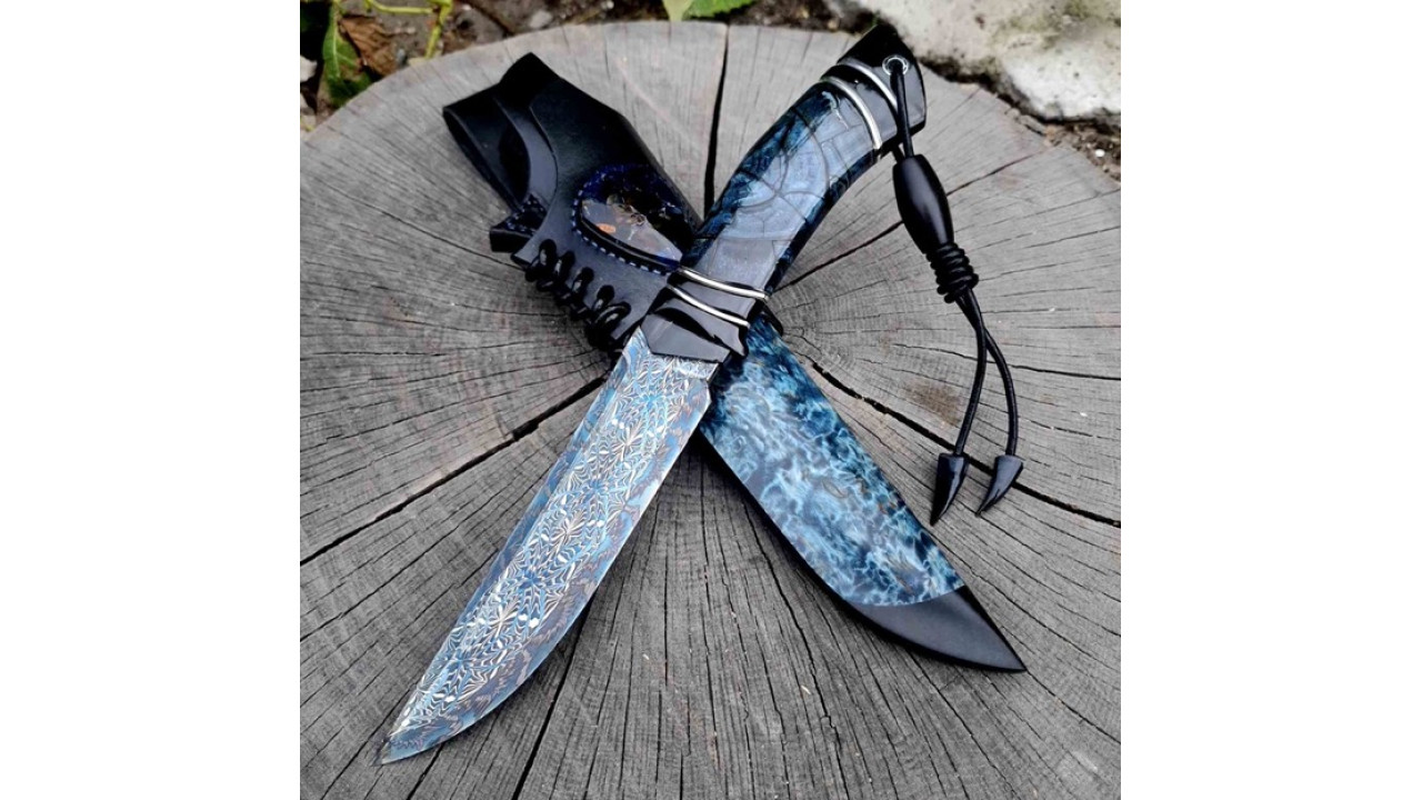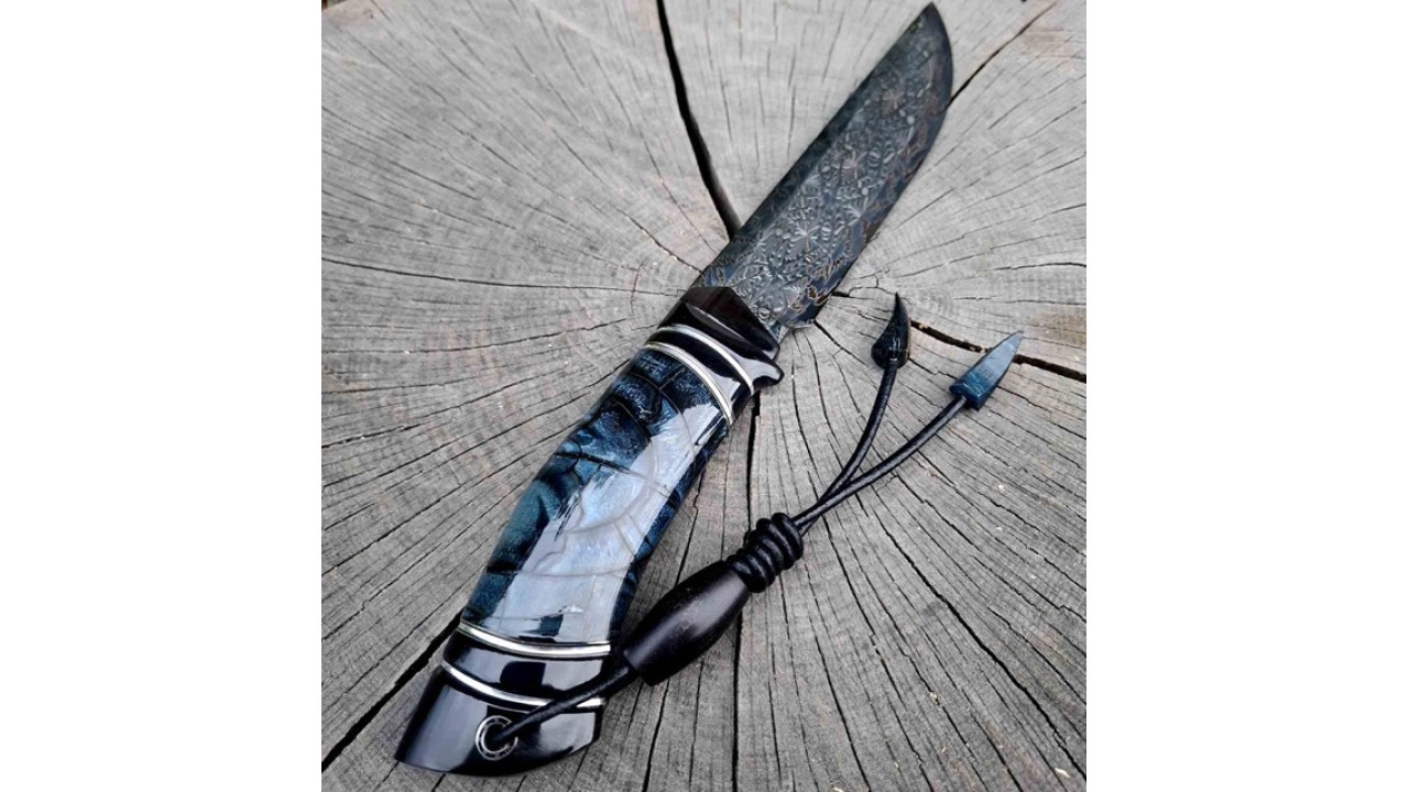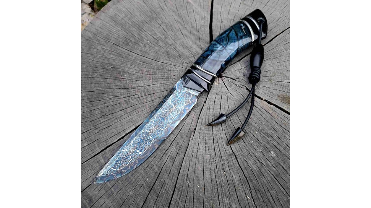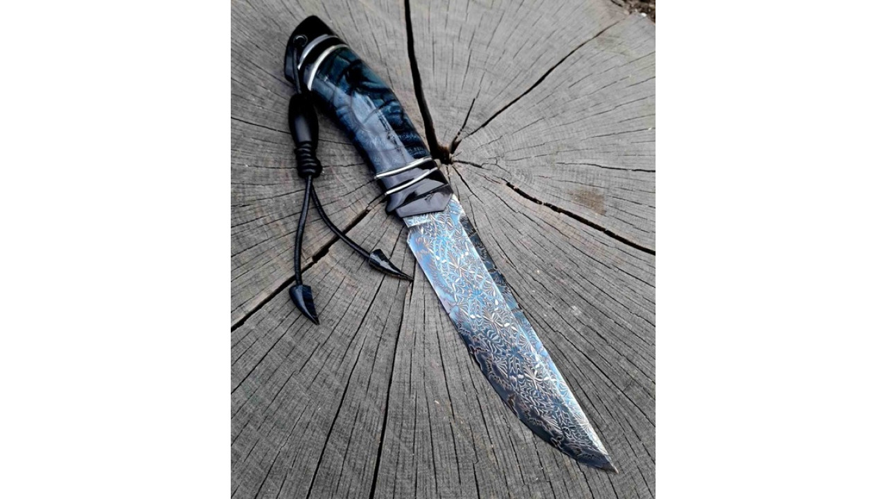 На фото: Ніж мисливський "Морська крапля". Клинок виготовлений з мозаїчного дамаска.
