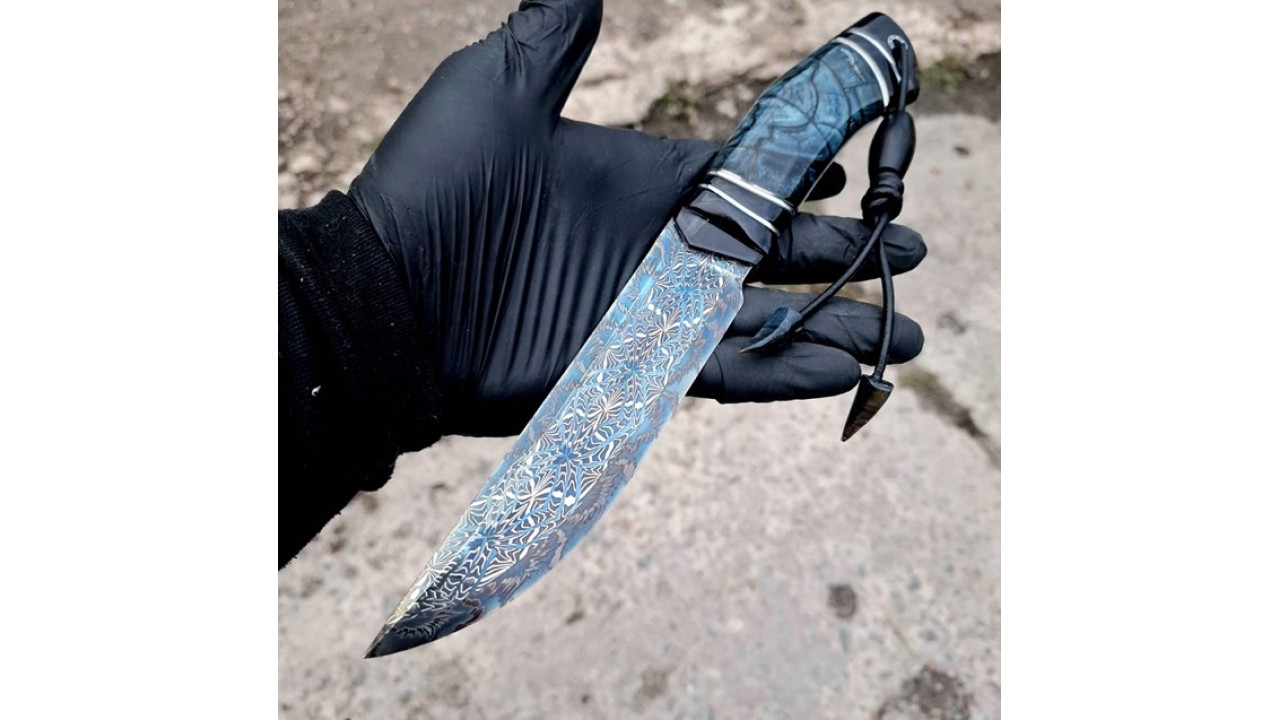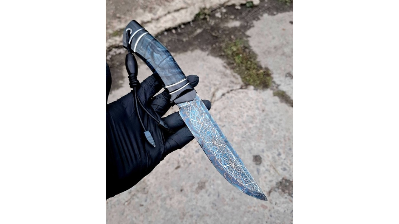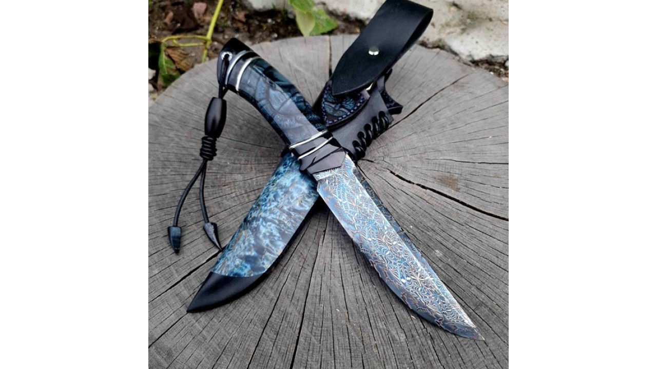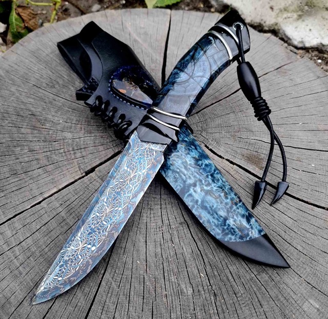 На фото: Ніж мисливський "Морська крапля". Клинок виготовлений з мозаїчного дамаска.
