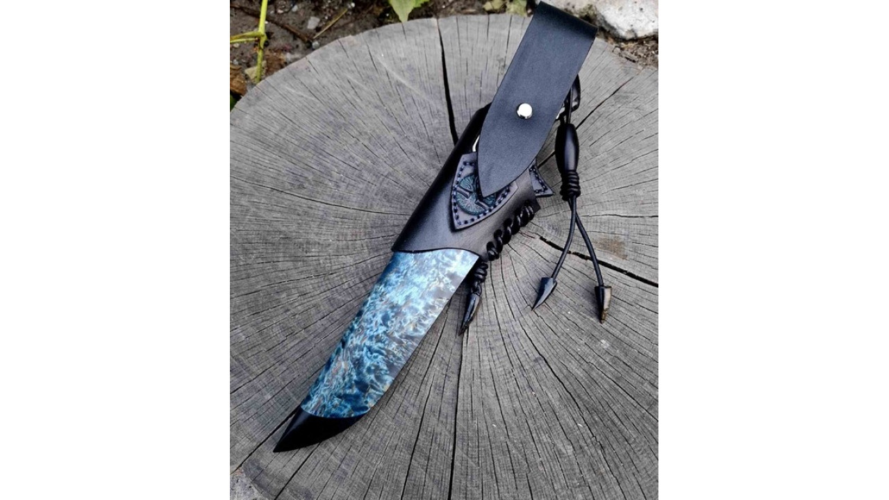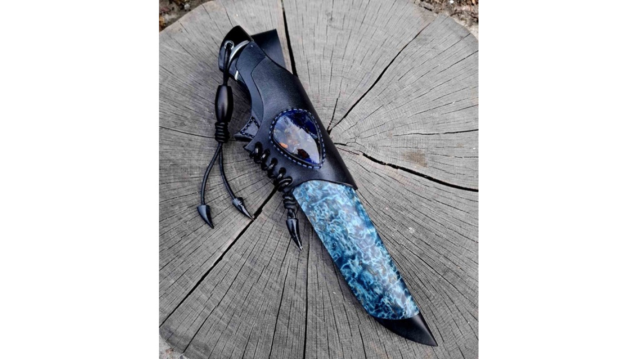 Піхви: Карельська береза, морений граб, ручне різьблення по дереву, італійська натуральна шкіра рослинного дублення, оброблена апретурою для захисту від води та просякнута захисними розчинами, прошита вощеною ниткою. Ручне тиснення фактури. Вставка на ножнах з бурштину в акрилі. Підвіс вільний, з'ємний