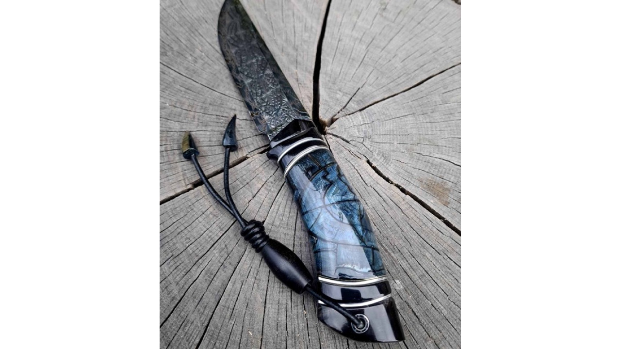 Матеріал руків'я: Стабілізований ріг буйвола, нейзельбер, мельхеор, стабілізований бивень мамонта, мозаічна темлячна трубка і пін.
