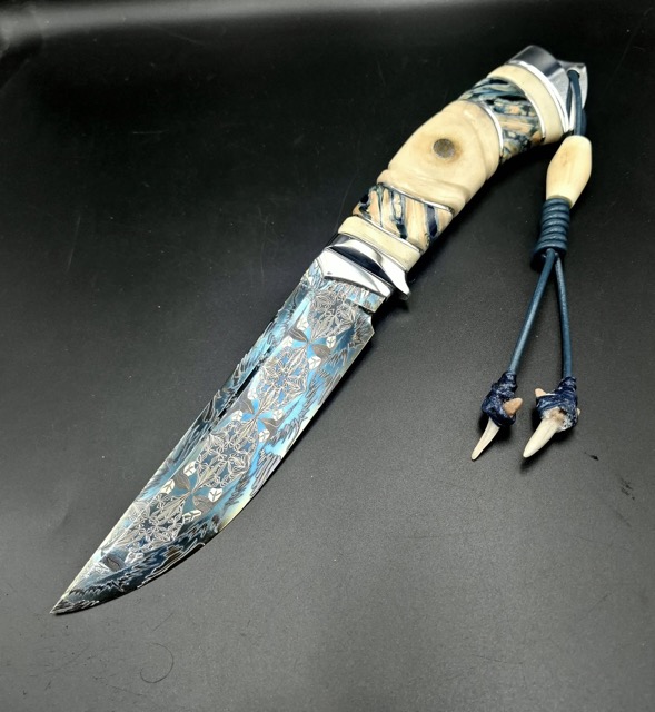 | Матеріал руків'я: | Нержавіюча сталь, стабілізований ріг, стабілізований зуб мамонта, мозаічна темлячна трубка з люмінефором (світиться блакитним в темноті) |