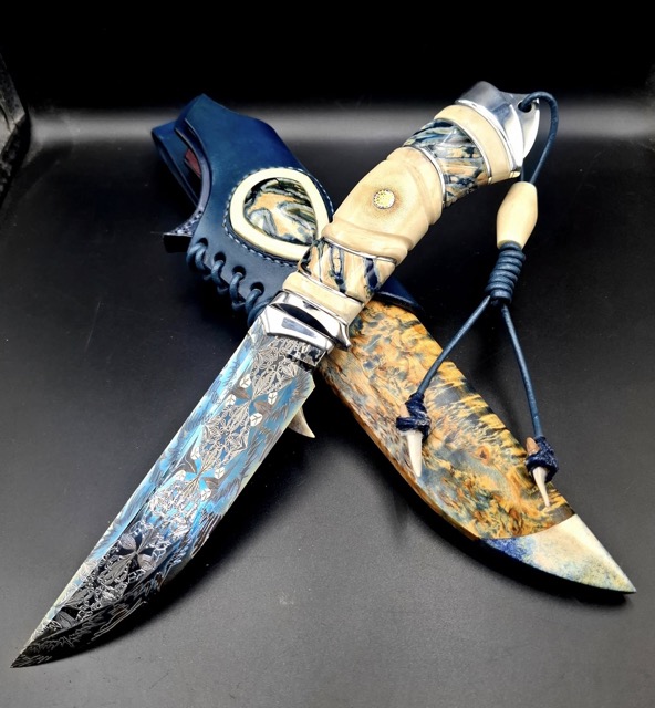 Піхви: Карельська береза, стабілізований ріг лося, ручне різьблення по дереву, італійська натуральна шкіра рослинного дублення, оброблена апретурою для захисту від води та просякнута захисними розчинами, прошита вощеною ниткою. Ручне тиснення фактури. Підвіс вільний, з'ємний. Вставка зі стабілізованого рога лося і зуба мамонта