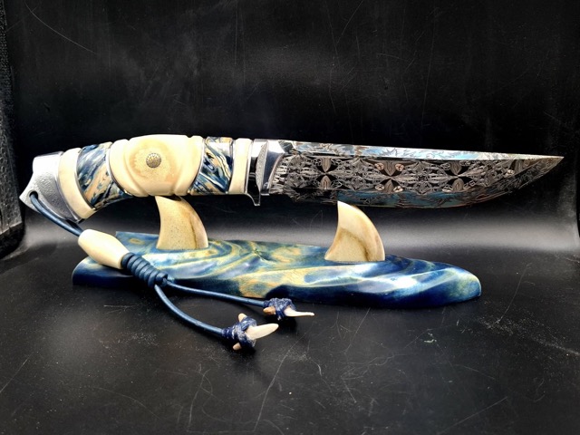 Матеріал руків'я: Нержавіюча сталь. Стабілізований ріг лося, стабілізований зуб мамонта, мозаічний пін і темлячна трубка. Темляк зі шкіряного шнура 3мм, бусини - зуби акули
