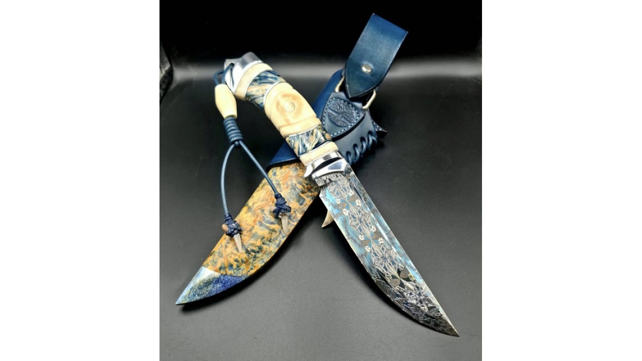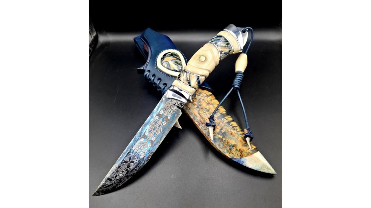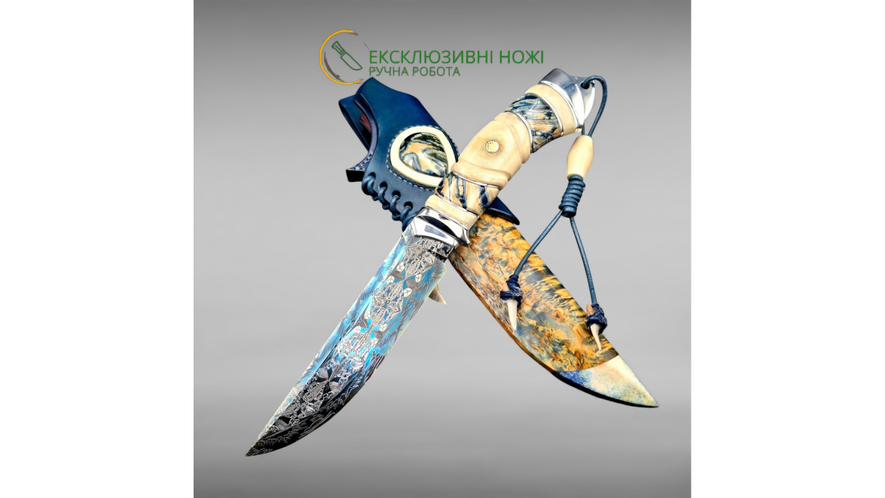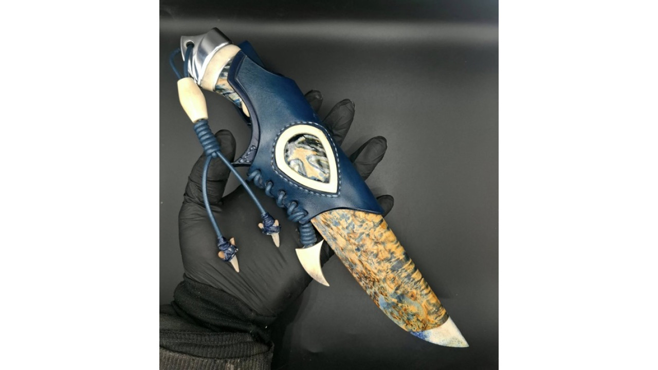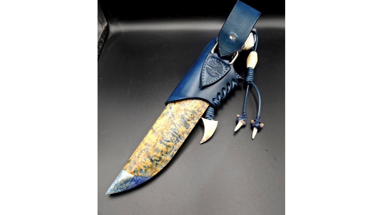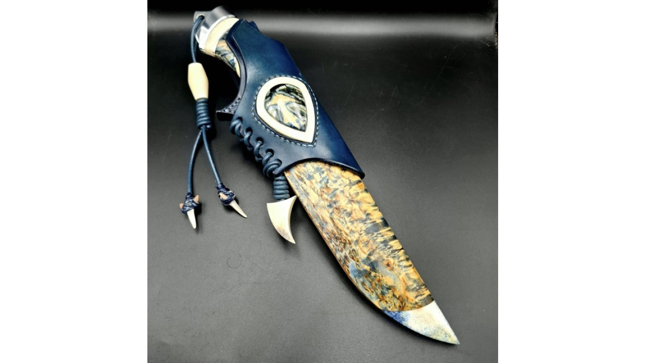 Піхви: Карельська береза, стабілізований ріг лося, ручне різьблення по дереву, італійська натуральна шкіра рослинного дублення, оброблена апретурою для захисту від води та просякнута захисними розчинами, прошита вощеною ниткою. Ручне тиснення фактури. Підвіс вільний, з'ємний. Вставка зі стабілізованого рога лося і зуба мамонта