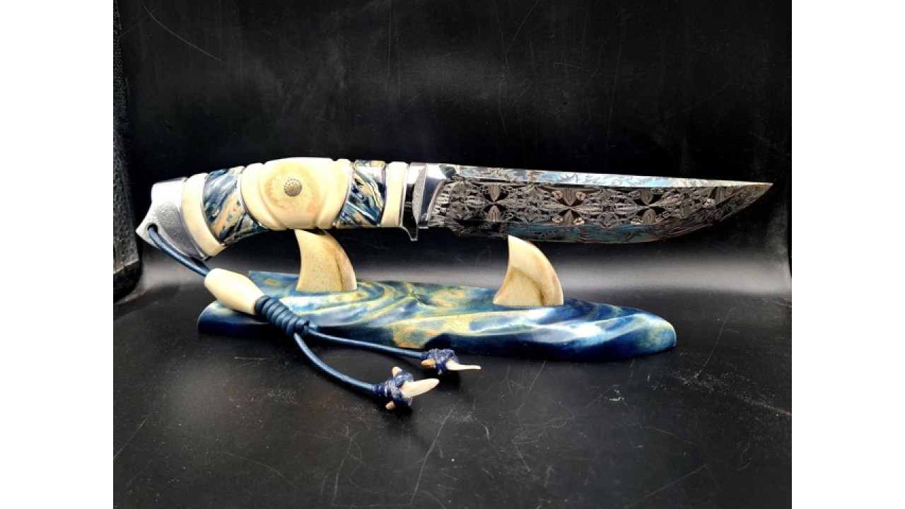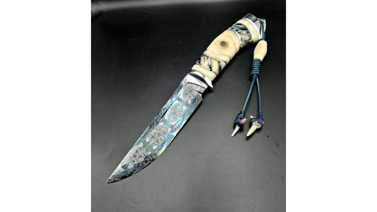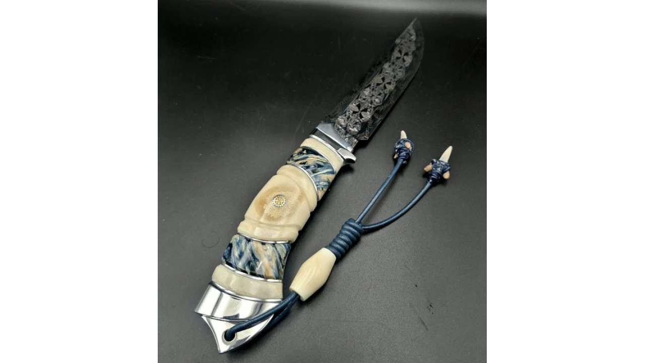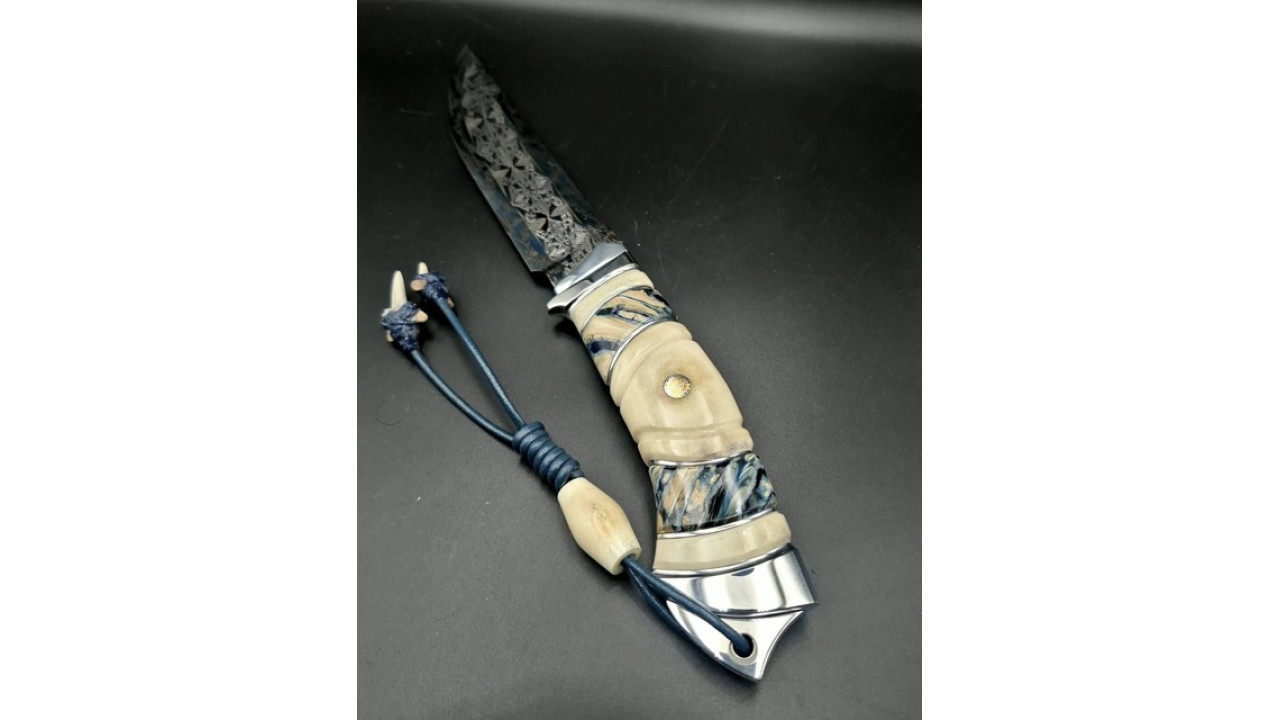 Матеріал руків'я: Нержавіюча сталь. Стабілізований ріг лося, стабілізований зуб мамонта, мозаічний пін і темлячна трубка. Темляк зі шкіряного шнура 3мм, бусини - зуби акули