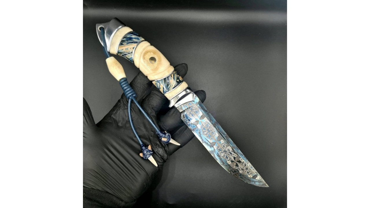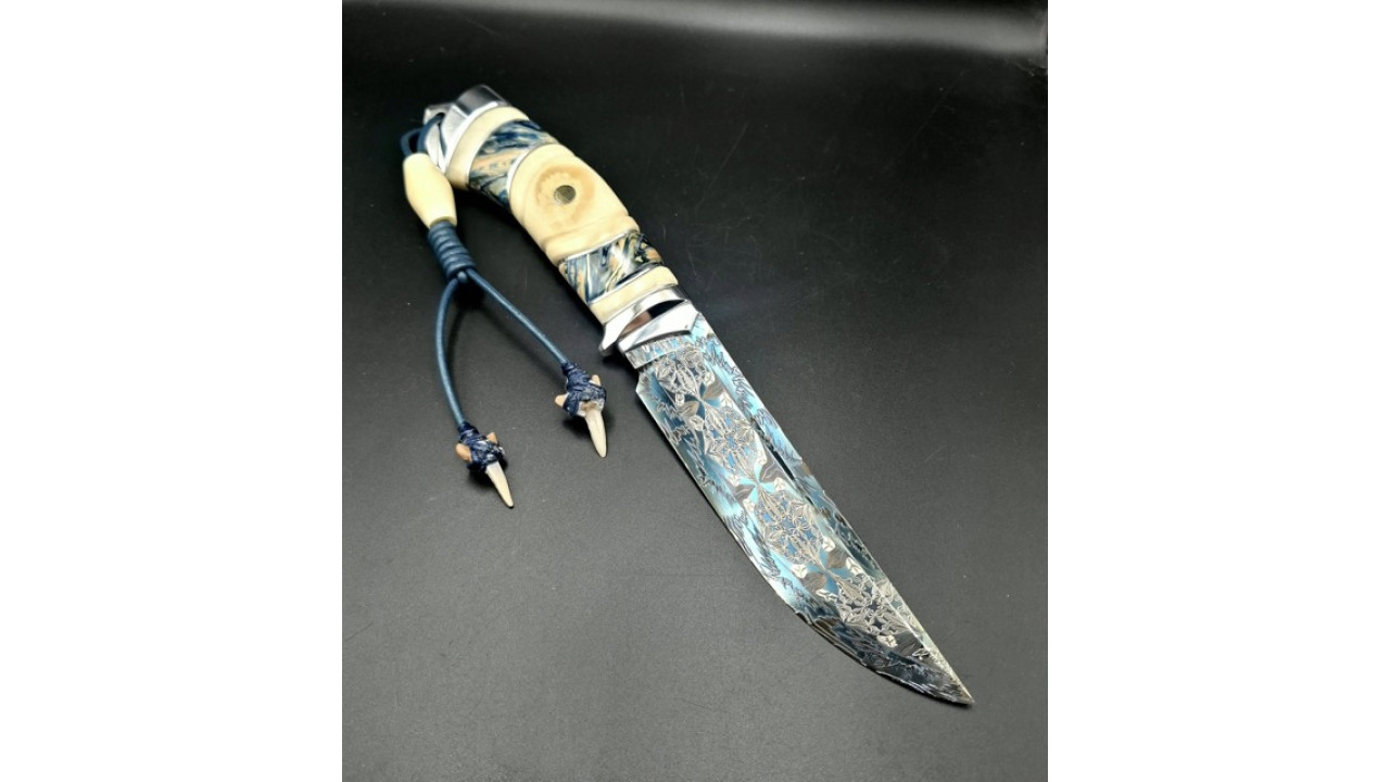 | Матеріал руків'я: | Нержавіюча сталь, стабілізований ріг, стабілізований зуб мамонта, мозаічна темлячна трубка з люмінефором (світиться блакитним в темноті) |