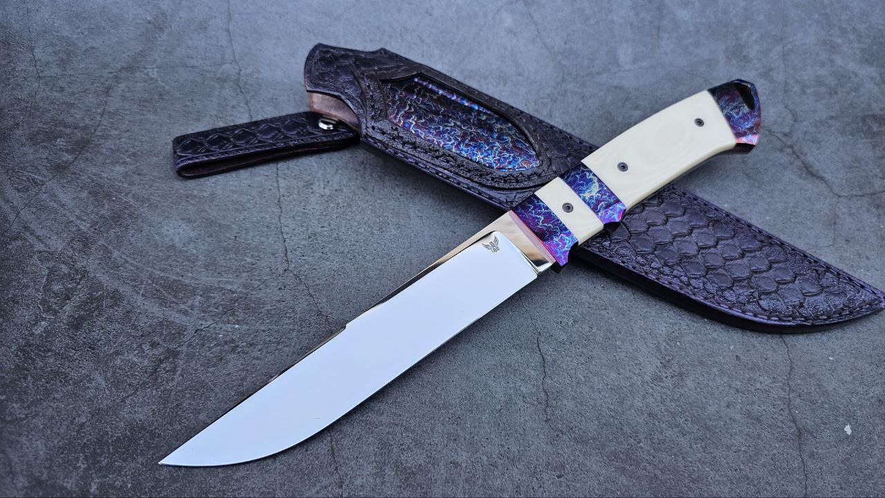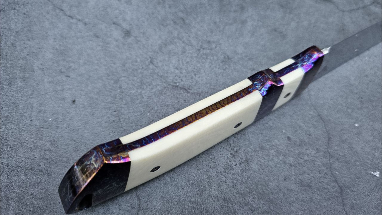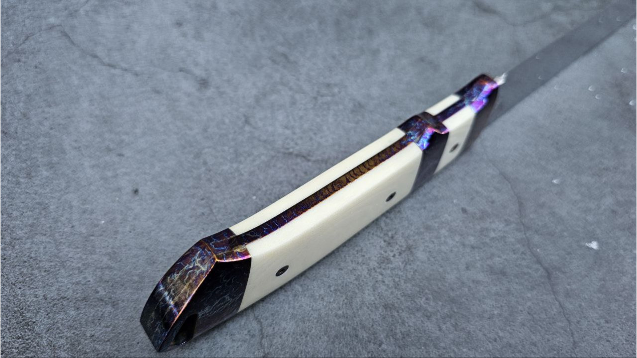 Матеріал больстера (гарда) та тильника: Больстер і  металеві проставки з оксидованого титану та мікарти