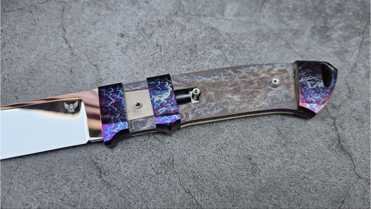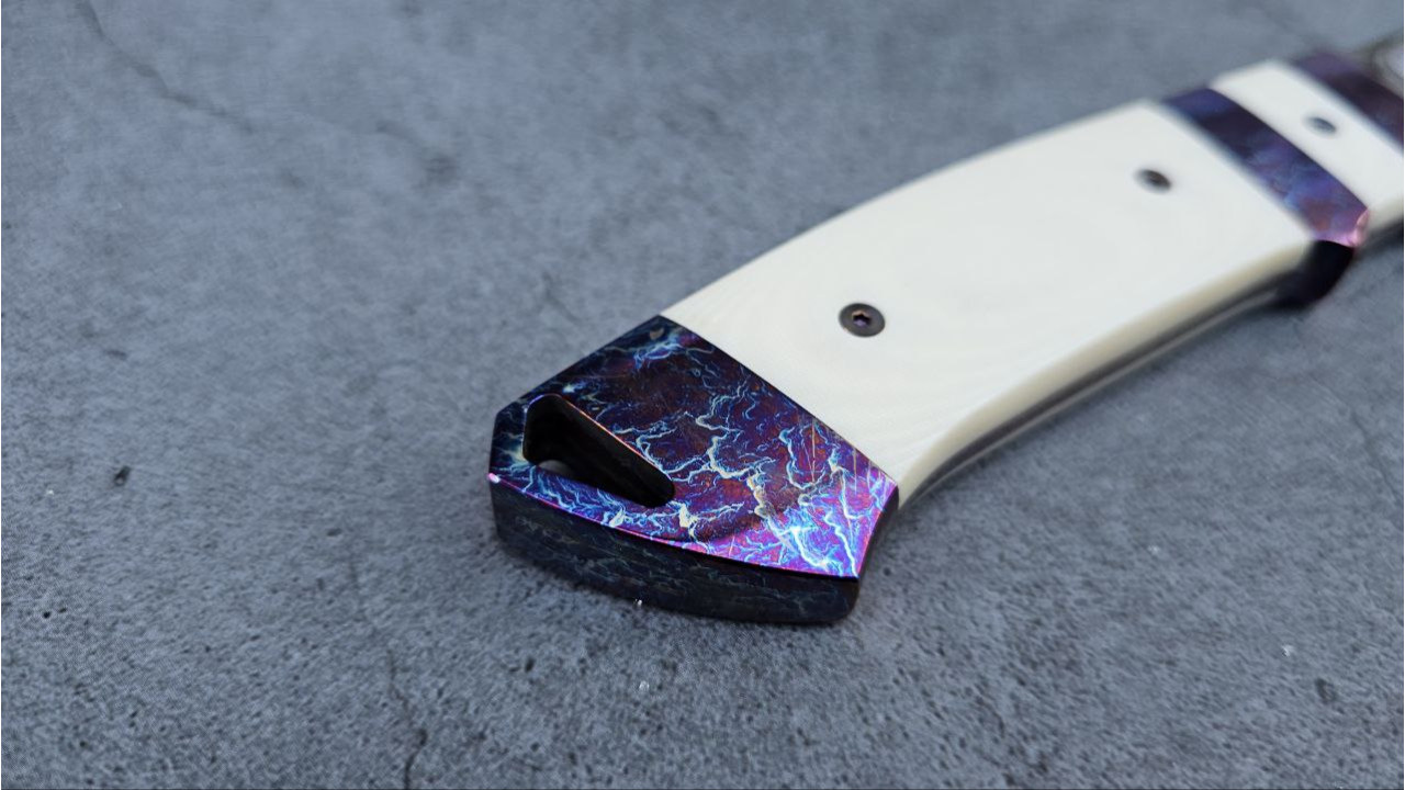 Матеріал руків'я: Больстер і  металеві проставки з оксидованого титану та мікарти. Рукоятка повністю розбирається. Клинок можна витягнути, можна замінити на інший
