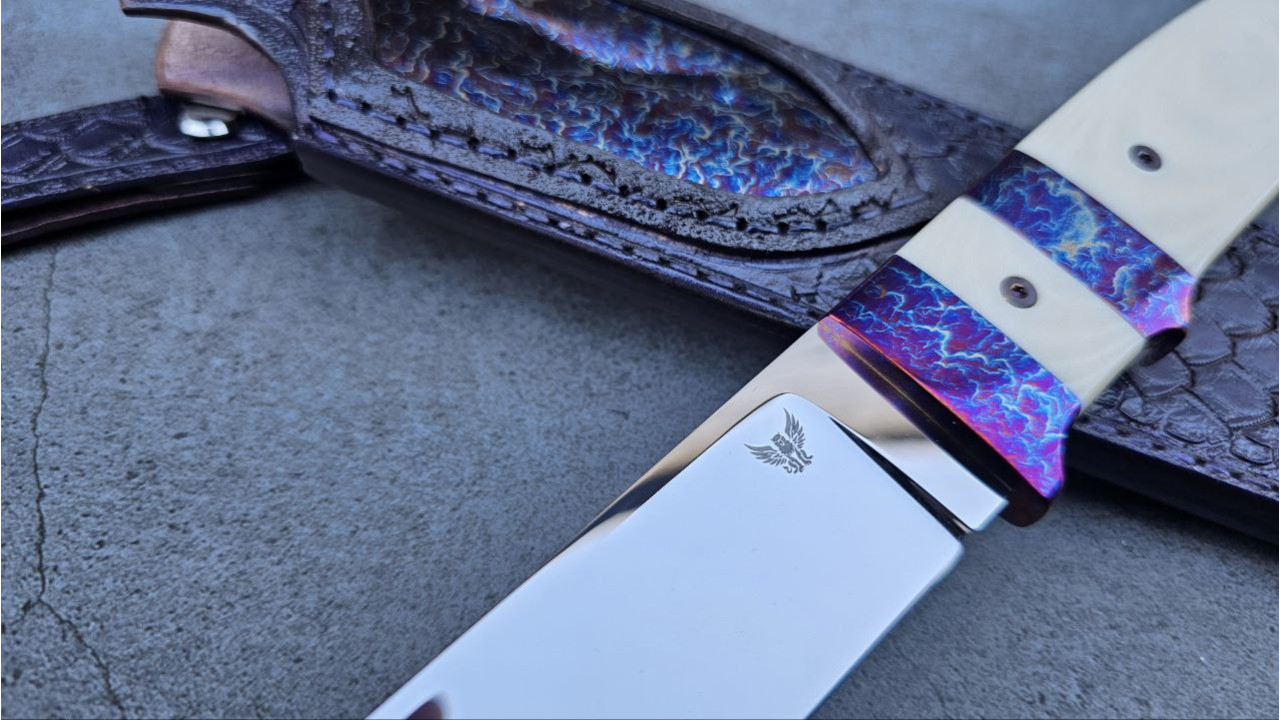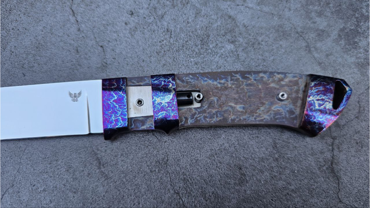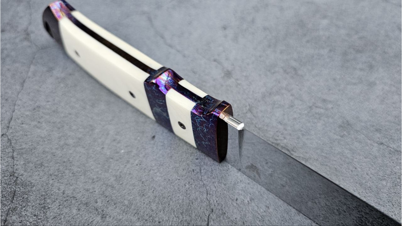 Матеріал руків'я: Больстер і  металеві проставки з оксидованого титану та мікарти. Рукоятка повністю розбирається. Клинок можна витягнути, можна замінити на інший