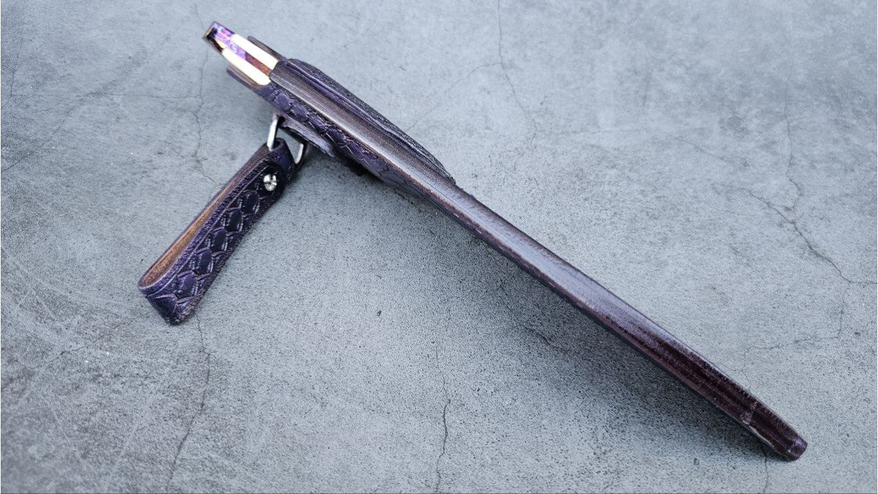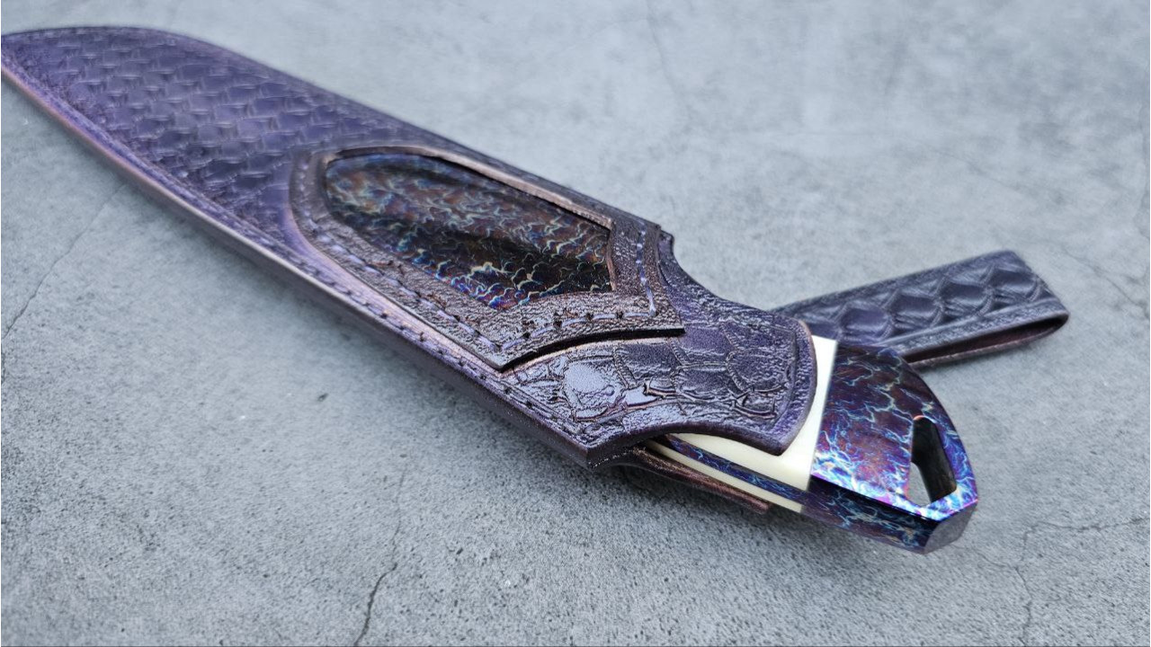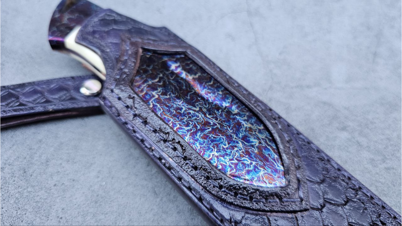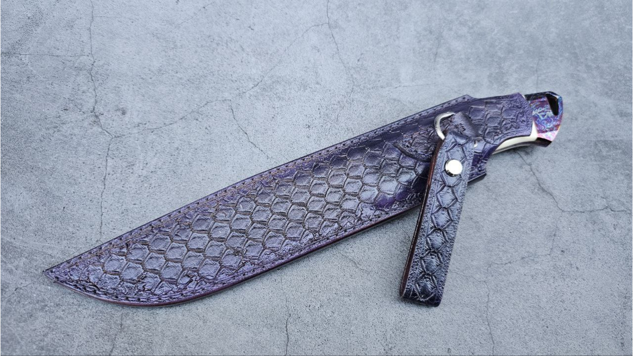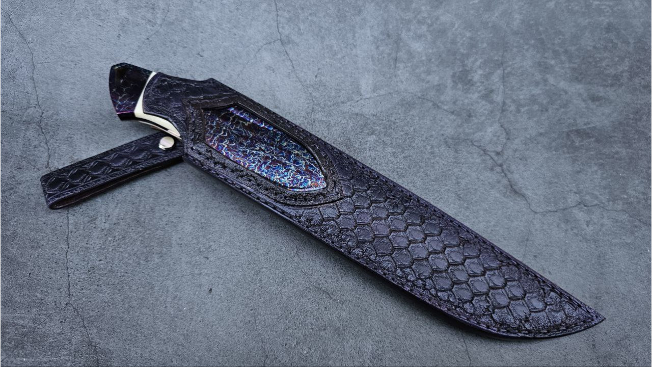 Піхви: Італійська натуральна теляча шкіра чепрак рослинного вичинки та дублення 4.0 мм, оброблена апретурою для захисту від води та просякнута захисними розчинами, прошита вручну вощеною ниткою. Ручне тиснення фактури, пофарбовано в два кольори. Підвіс вільний