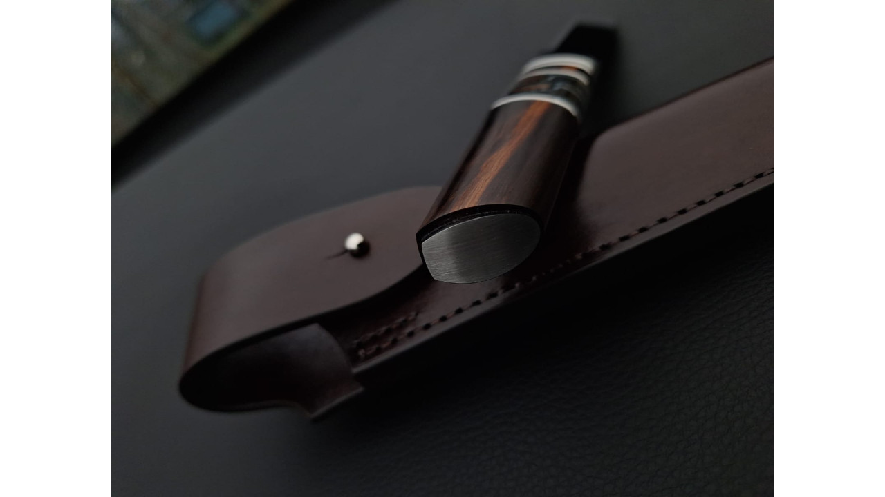 Піхви: Італійська натуральна теляча шкіра чепрак рослинного вичинки та дублення 4.0 мм, оброблена апретурою для захисту від води та просякнута захисними розчинами, прошита вручну вощеною ниткою. Ручне тиснення фактурита. Вставка - шкіра пітона. Вільний підвіс та підвіс на пасок (відомого майстра ручної роботи зі шкіроюі - Андрія Курінного)