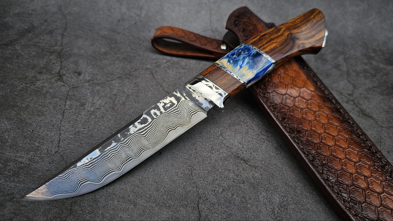 | Матеріал леза | Сталь марки CPM REX 121 інструментальний порошковий швидкорізальний сплав американської компанії Crucible Industries LLC в ламінаті (техніка San-May - ручне кування клинка) - CPM REX 121 в обкладках із нержавіючого дамаску |