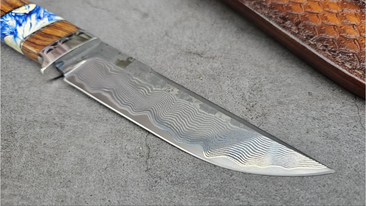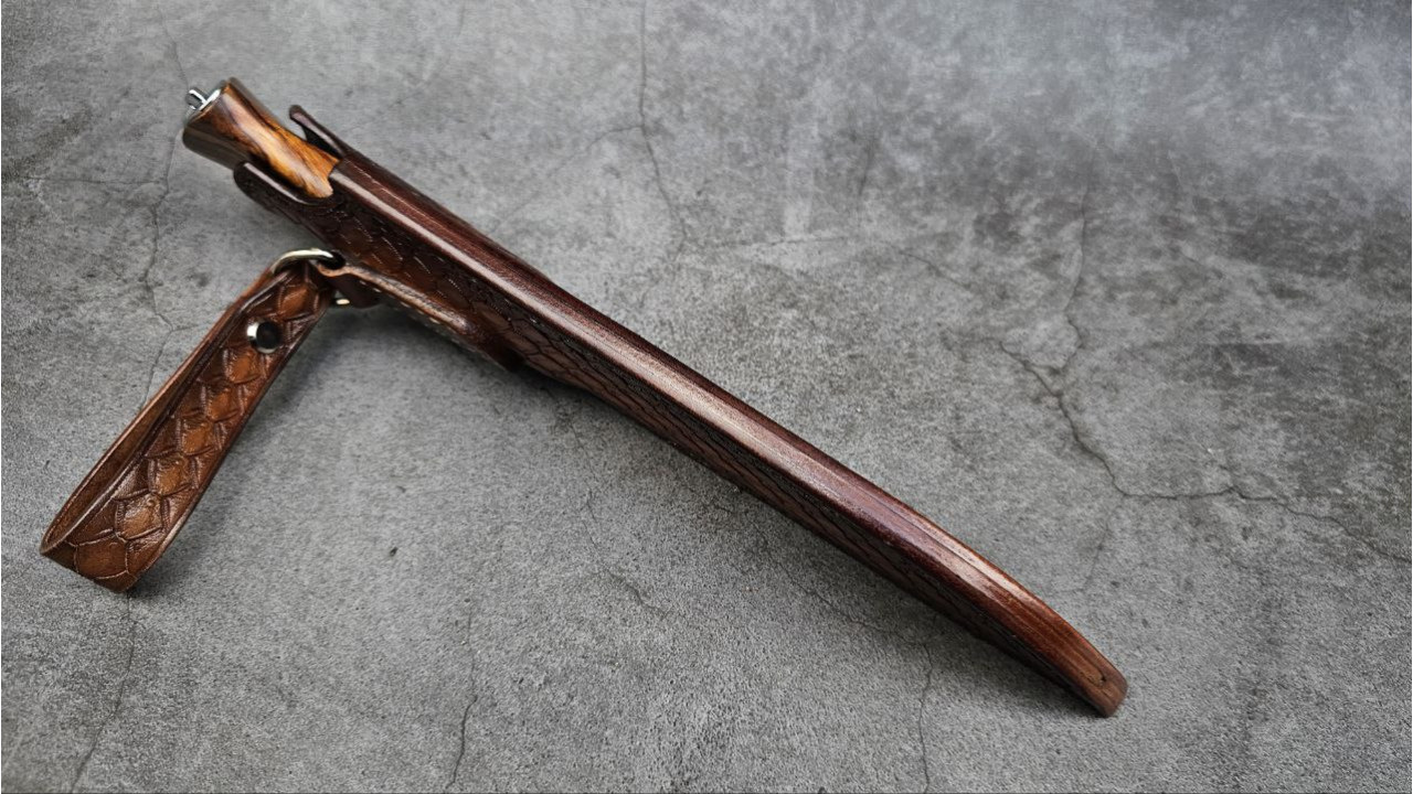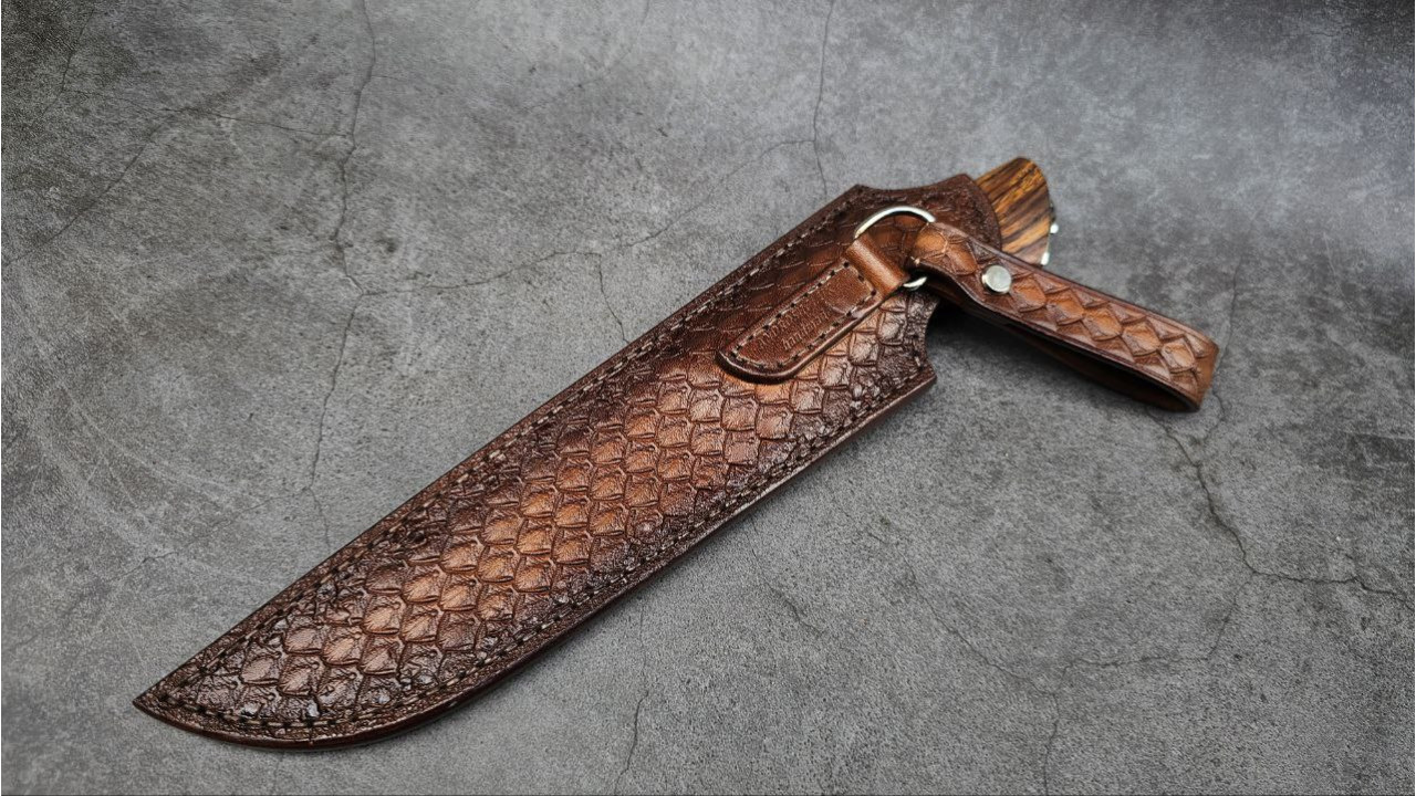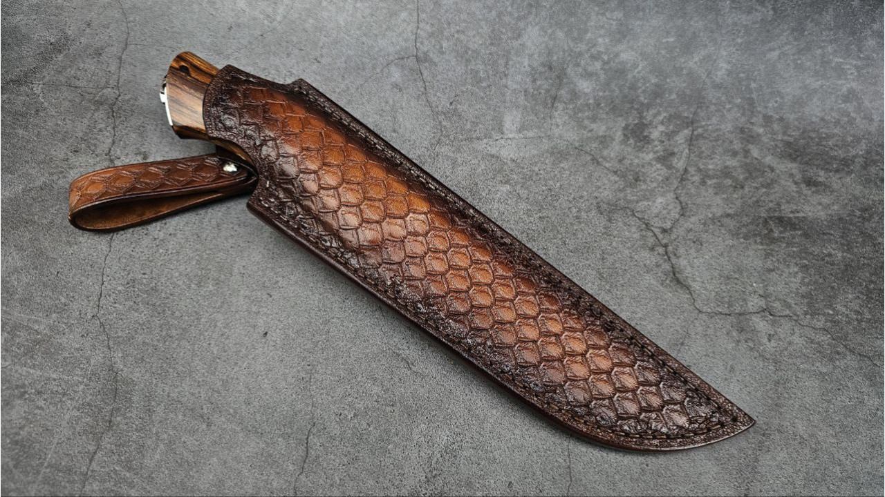 Піхви: Італійська натуральна теляча шкіра чепрак рослинного вичинки та дублення 4.0 мм, оброблена апретурою для захисту від води та просякнута захисними розчинами, прошита вручну вощеною ниткою. Ручне тиснення фактури