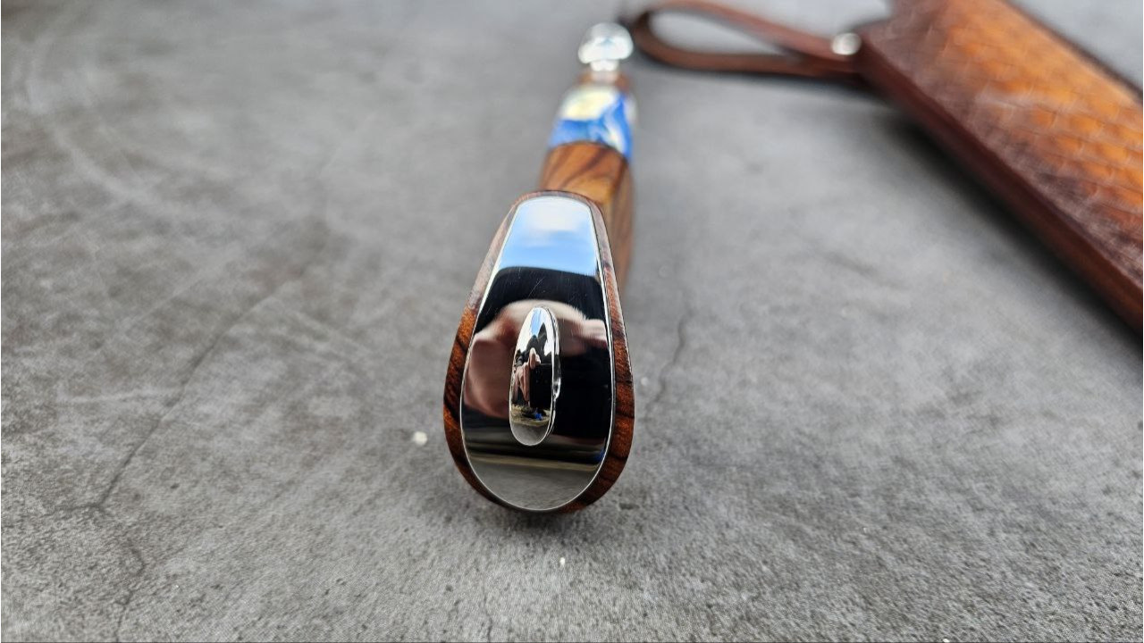 Марка сталі: Клинок - сталь марки CPM REX 121 інструментальний порошковий швидкорізальний сплав американської компанії Crucible Industries LLC в ламінаті (техніка San-May - ручне кування клинка) - CPM REX 121 в обкладках із нержавіючого дамаску