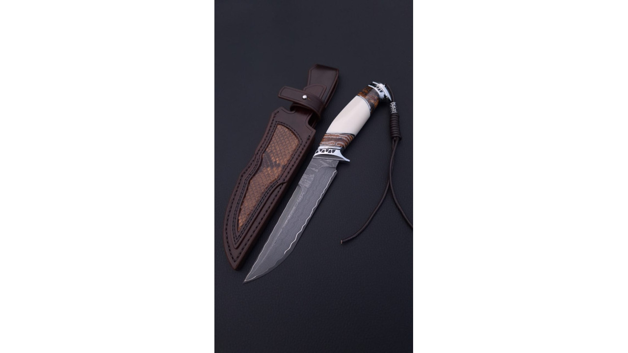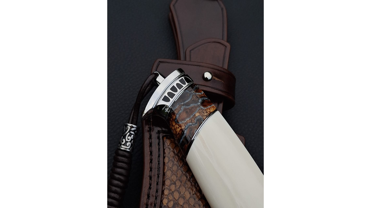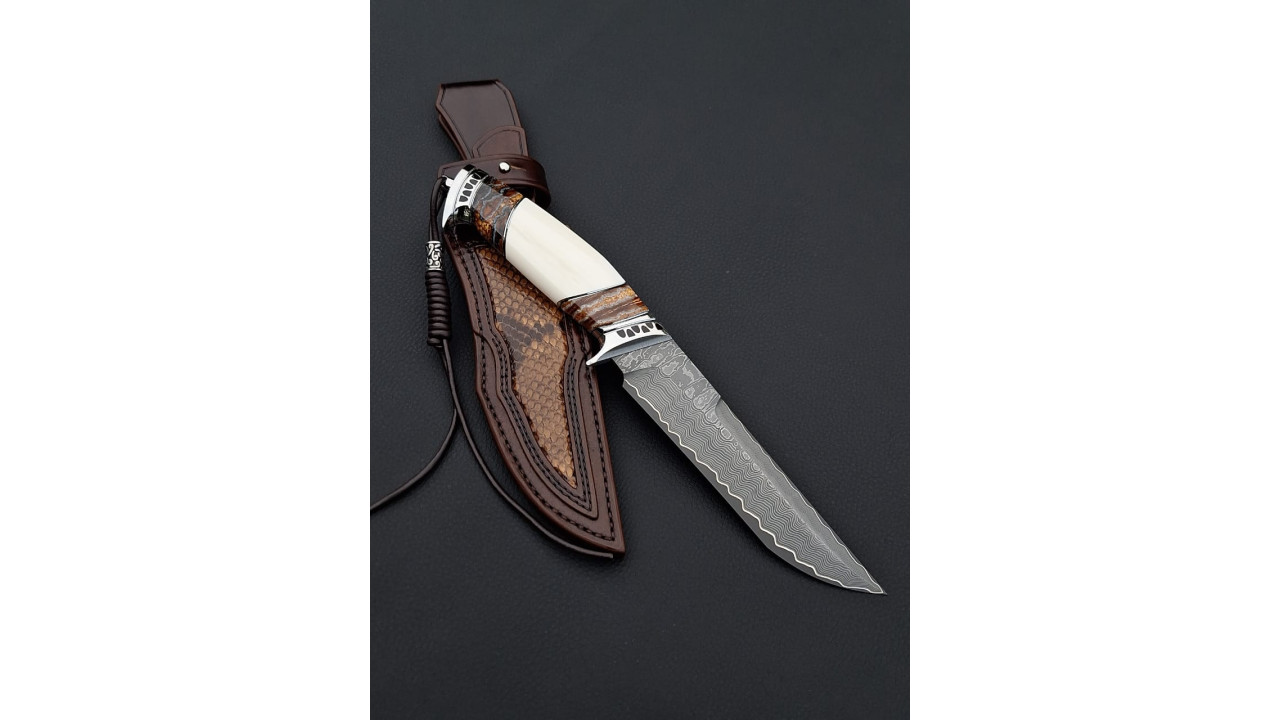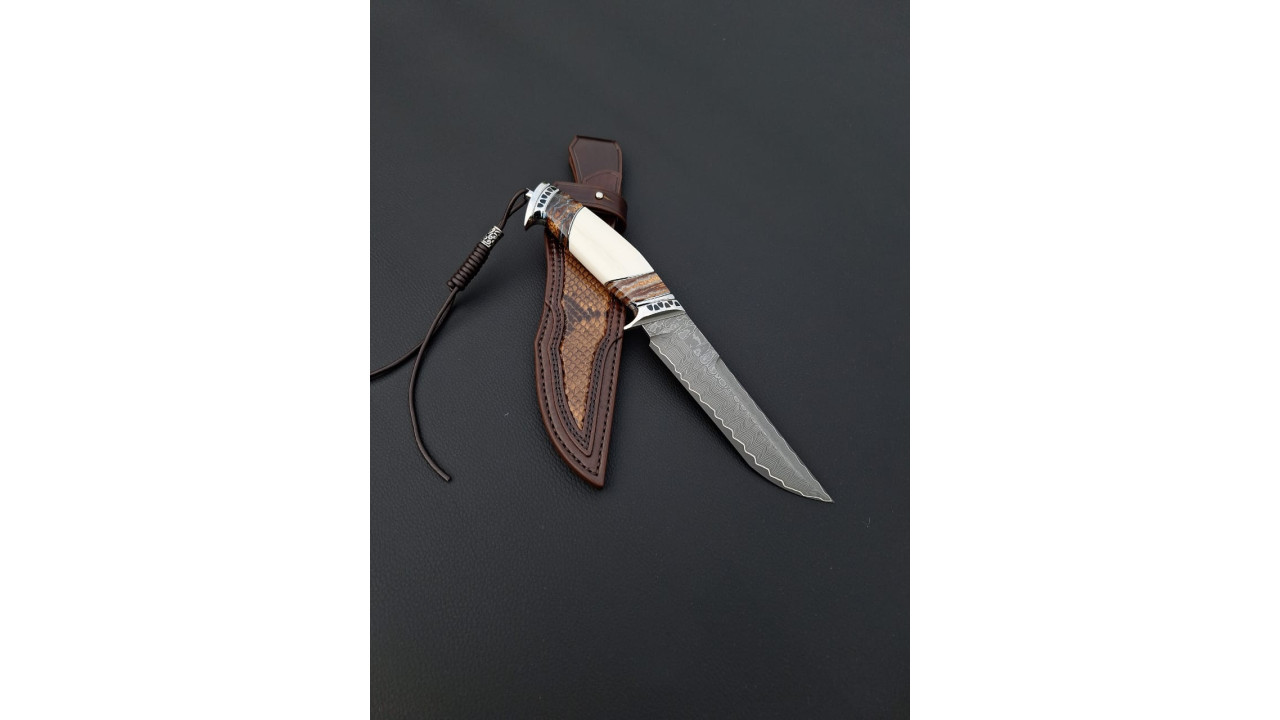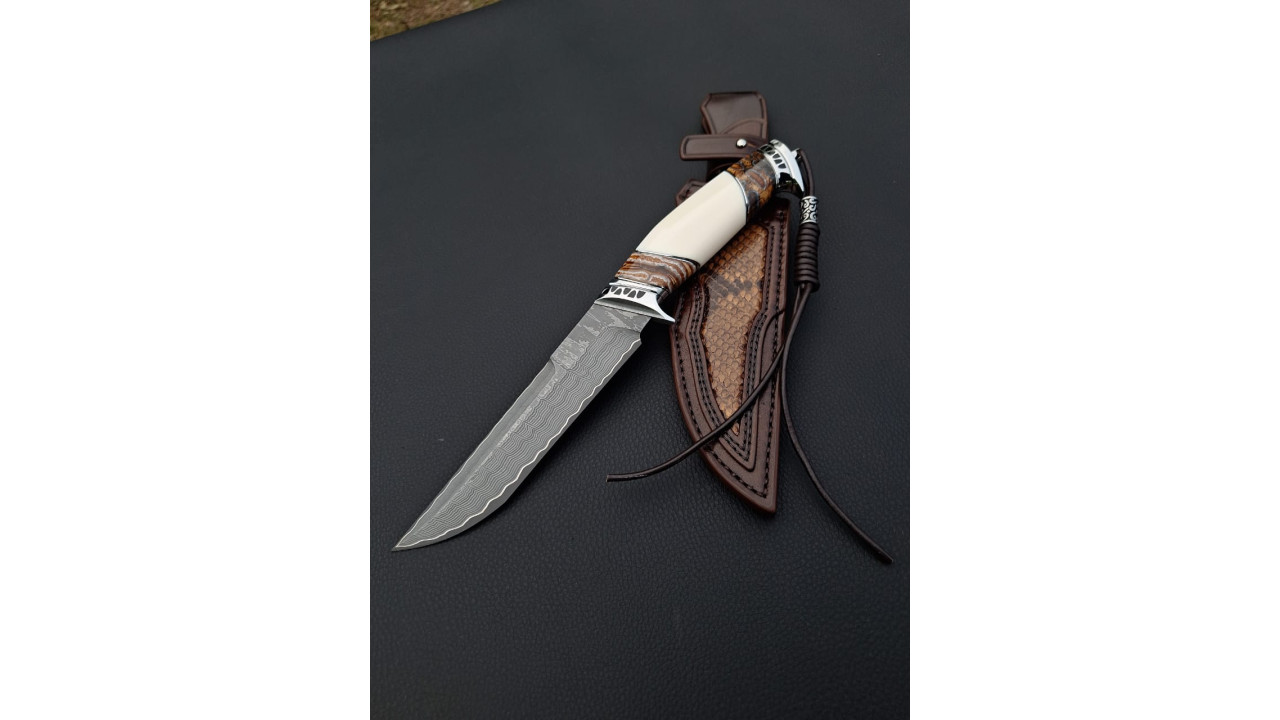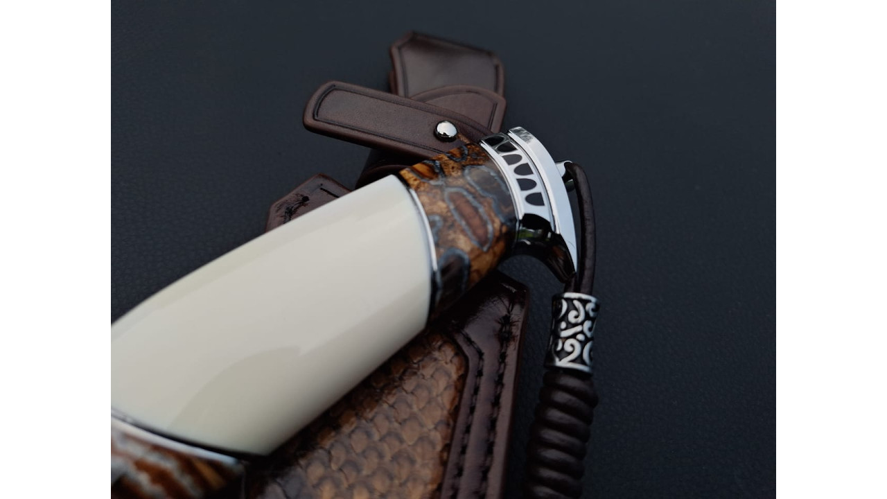 Зуб мамонта – виробний матеріал тваринного походження. Його винятковою особливістю є той факт, що його джерелом є вимерлі звірі – мамонти. Палеонтологами було встановлено, що вони жили на Землі близько 10 тисячоліть тому, і їхня кількість була дуже велика. Зуби у мамонтів були не постійними і змінювалися приблизно чотири рази протягом життя. Зуби, що випали, які сучасні вчені знаходять під час розкопок, і стають основою для декоративних елементів, серед яких є і рукояті ножів.