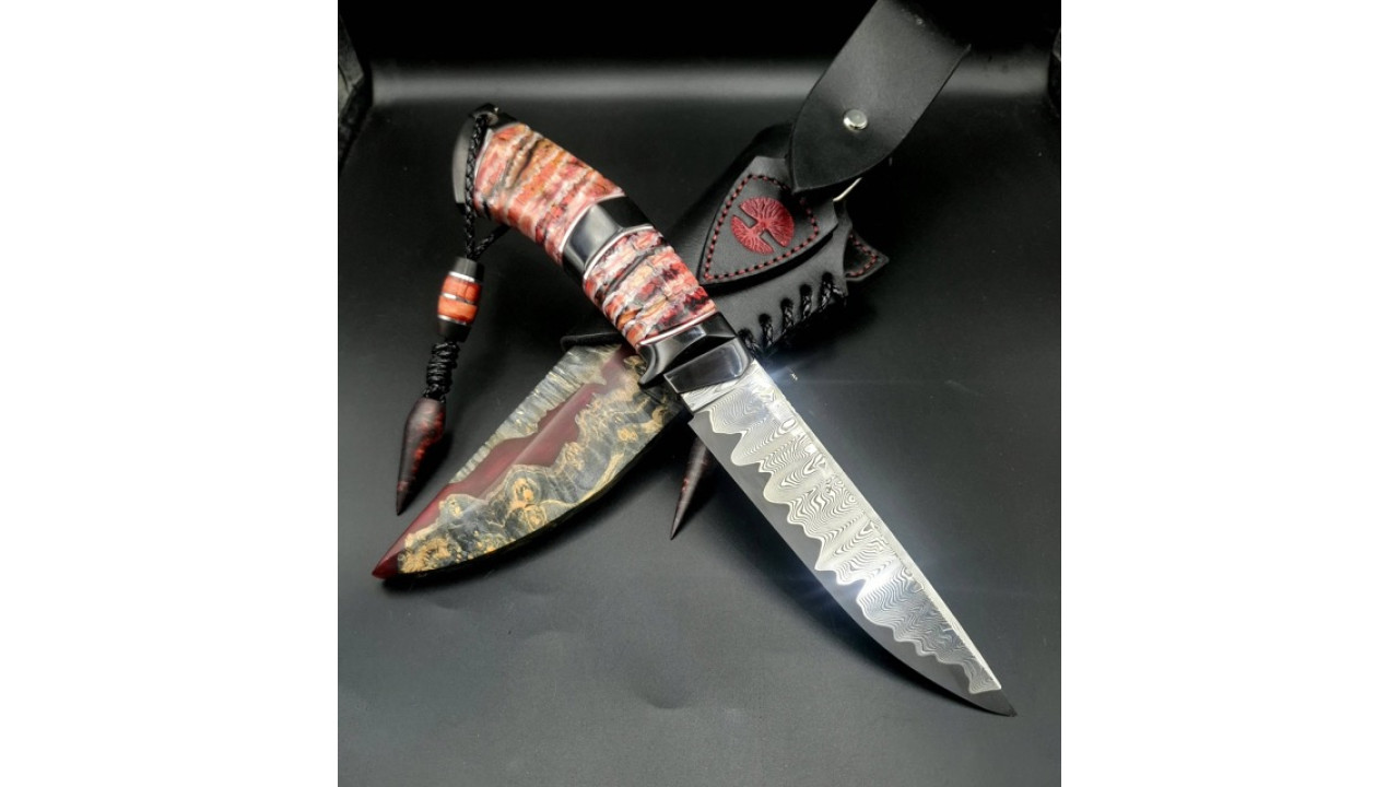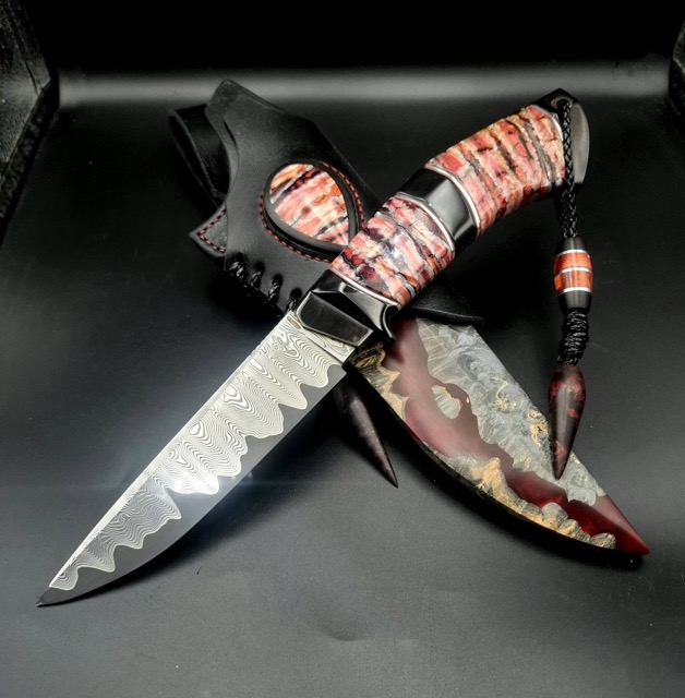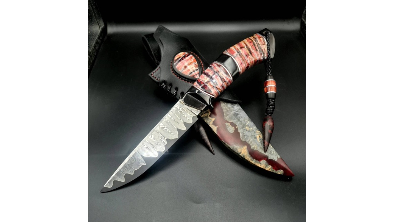 Піхви: Гібрид зі стабілізованого капу клену і акрилу з перламутром, ручне різьблення по дереву, італійська натуральна шкіра рослинного дублення, оброблена апретурою для захисту від води та просякнута захисними розчинами, прошита вощеною ниткою. Ручне тиснення фактури. Підвіс вільний, з'ємний. Вставка на ножнах з рога буйвола і зуба мамонта