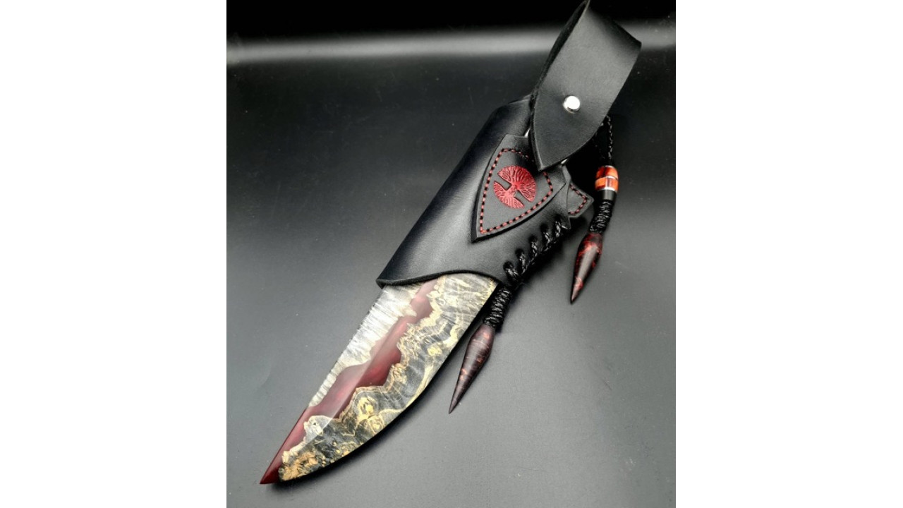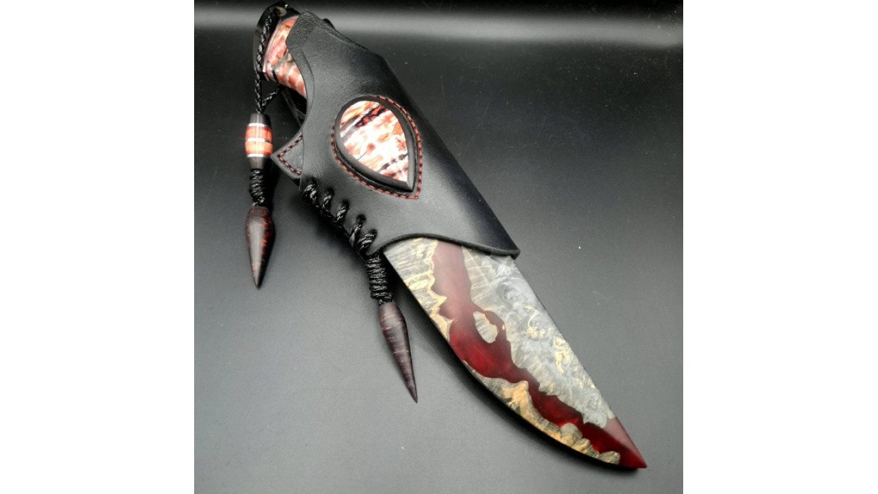 Піхви: Гібрид зі стабілізованого капу клену і акрилу з перламутром, ручне різьблення по дереву, італійська натуральна шкіра рослинного дублення, оброблена апретурою для захисту від води та просякнута захисними розчинами, прошита вощеною ниткою. Ручне тиснення фактури. Підвіс вільний, з'ємний. Вставка на ножнах з рога буйвола і зуба мамонта