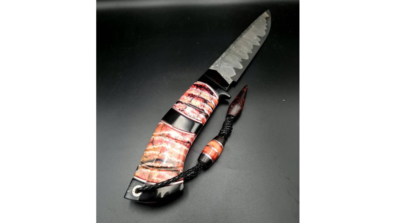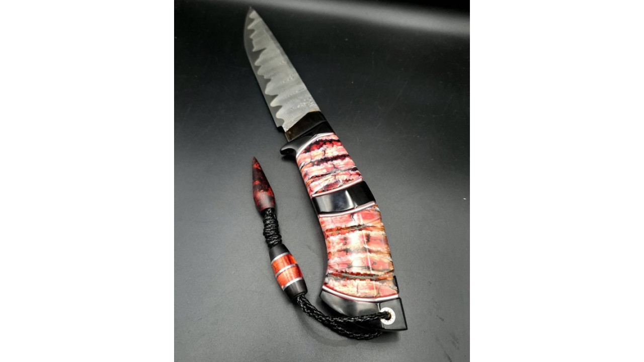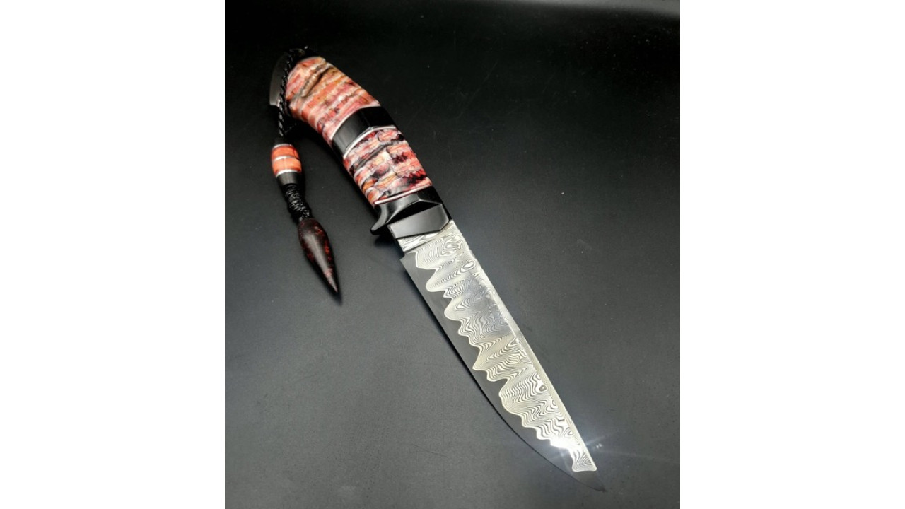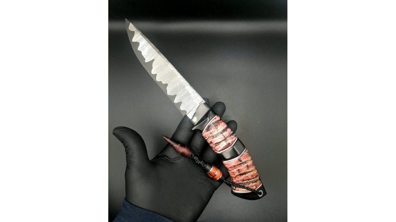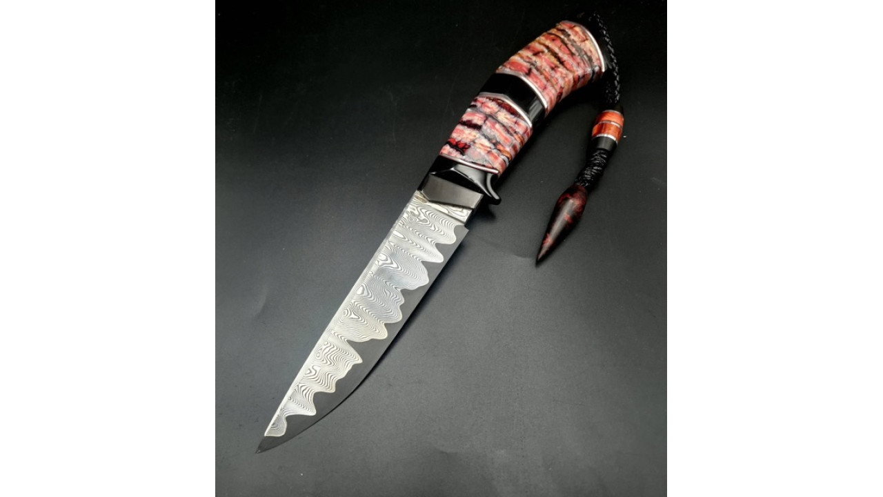 Руків'я: Ріг азіатського буйвола, стабілізований зуб мамонта, нейзельбер, мозаічний пін, тильник зі стабілізованого бивня мамонта.