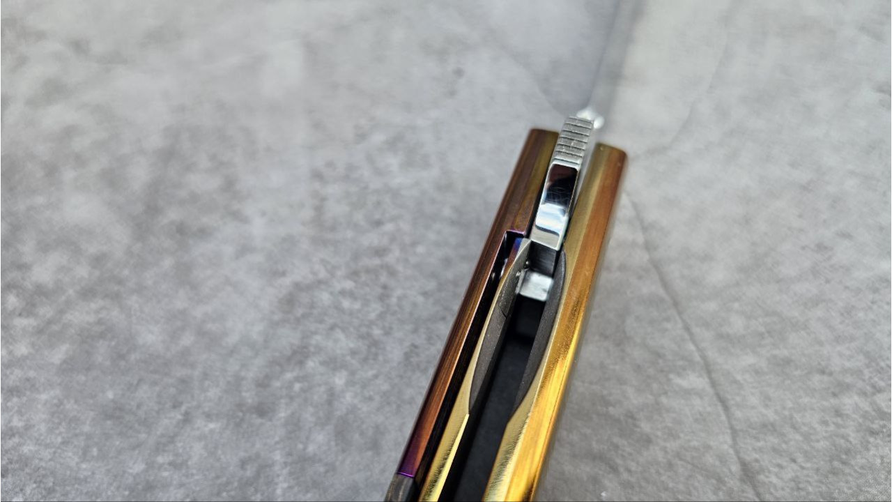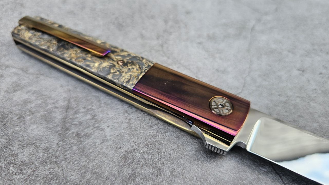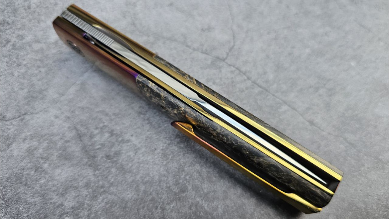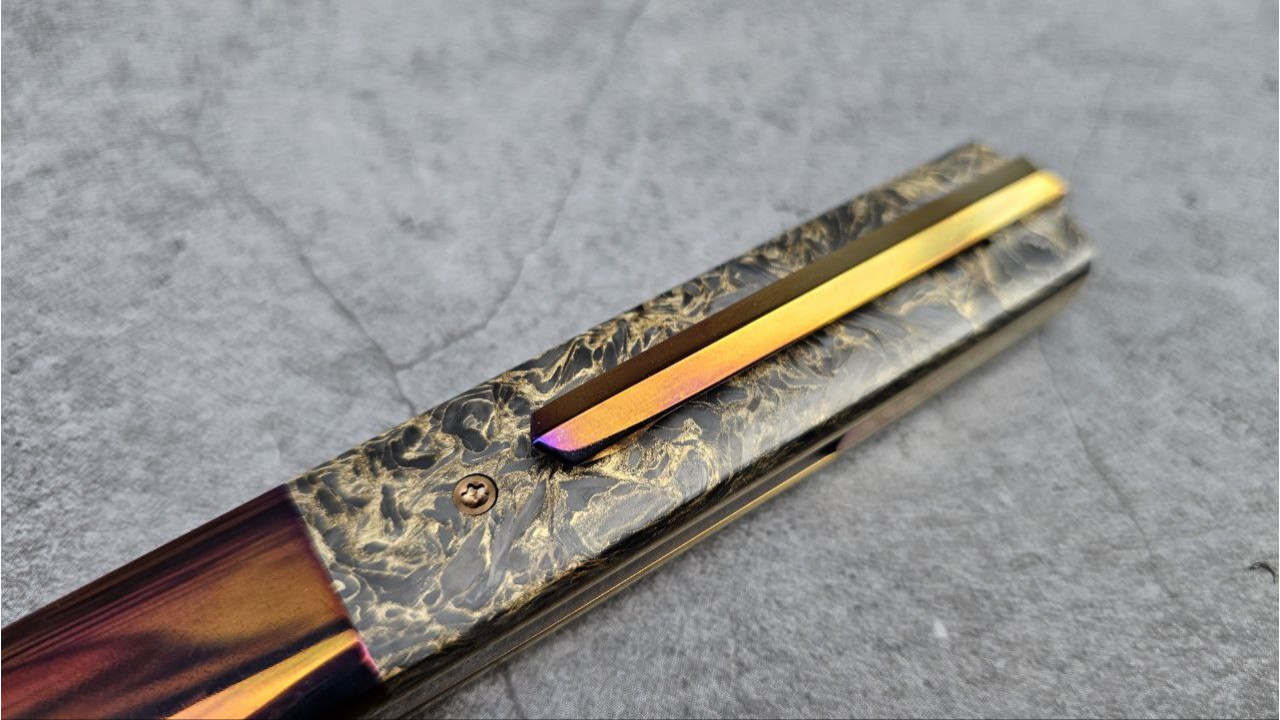 | Матеріал руків'я: | Притини: анодований титан. Накладки: карбон від Fat Carbon Dark Matter Gold. Лайнера: титан. Осьовий підшипник: керамічний. Шарик детента: керамічний. Сухарик: загартована сталь N690. Кліпса: титан. |