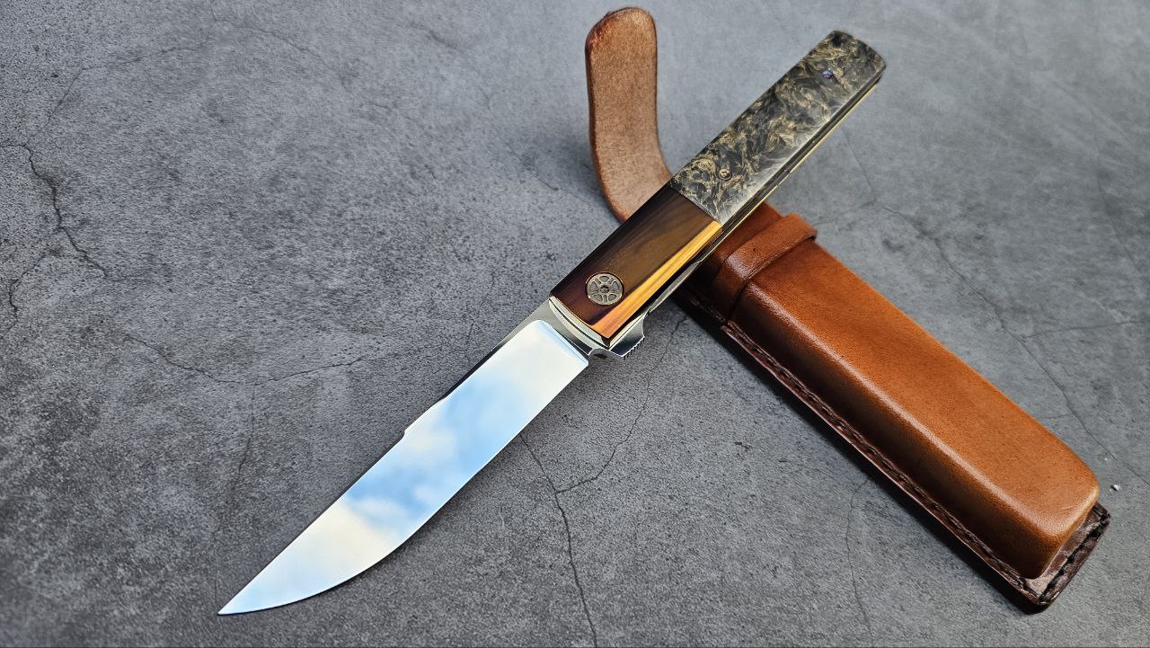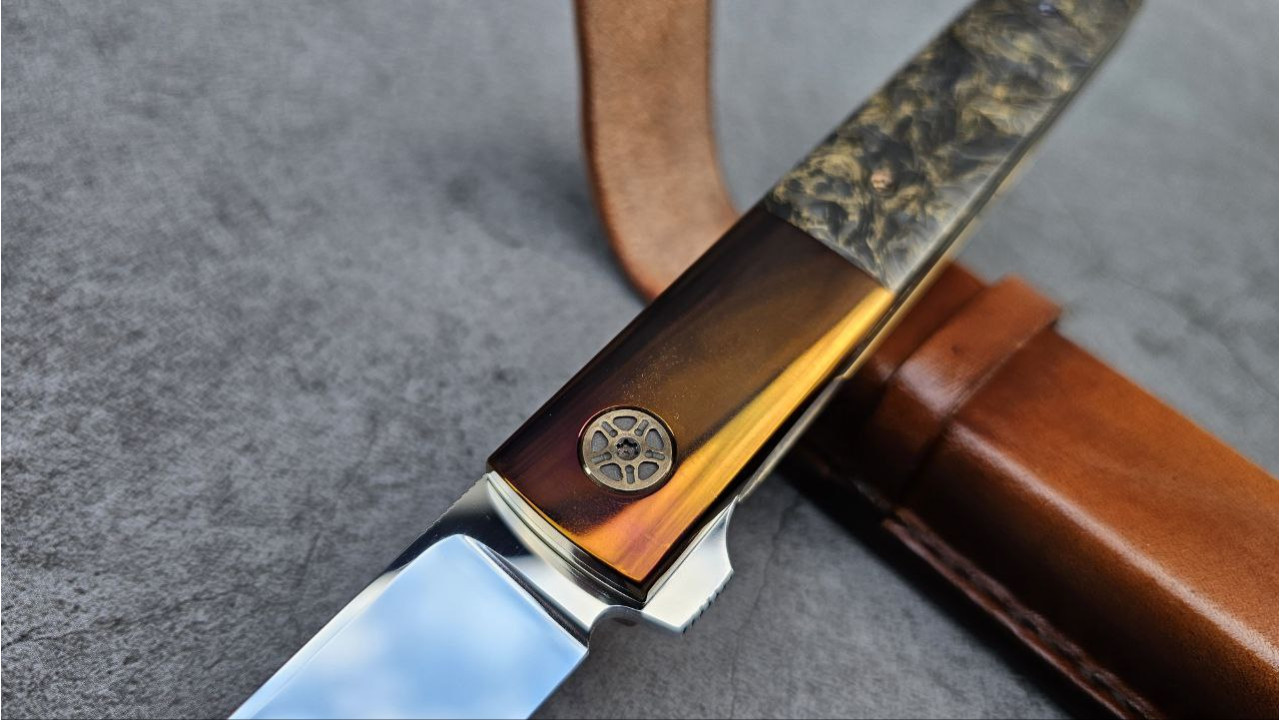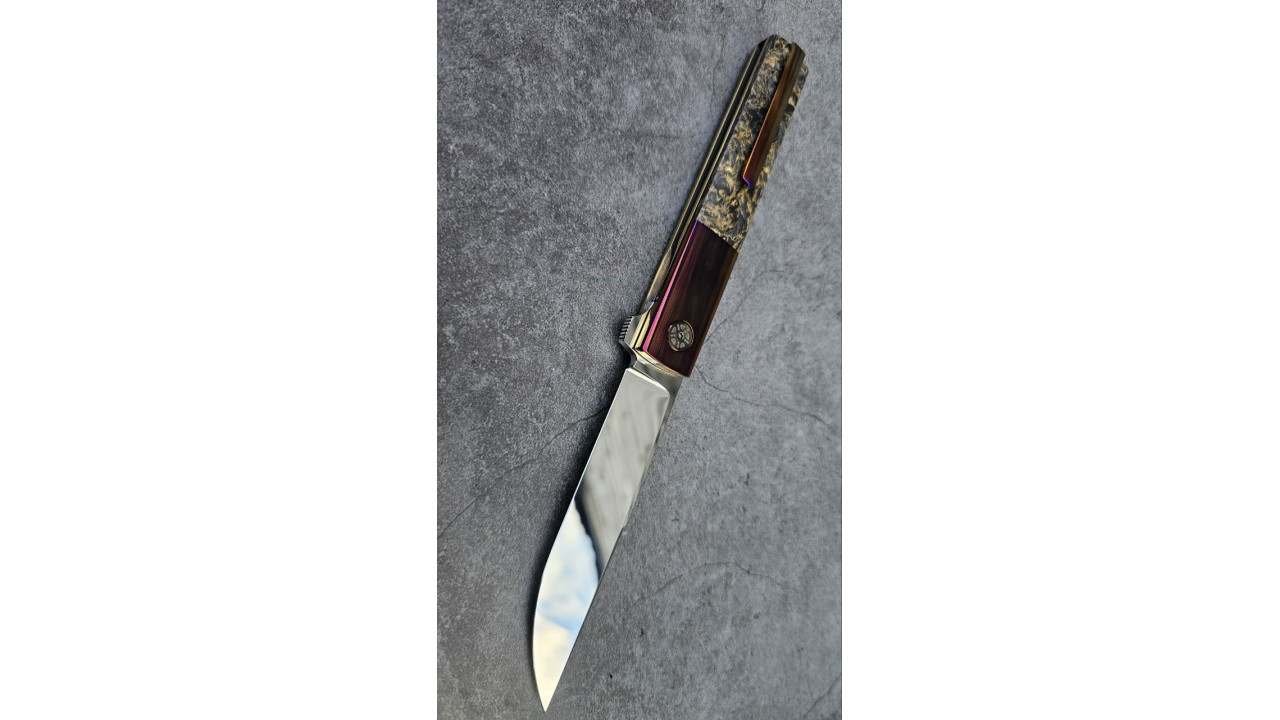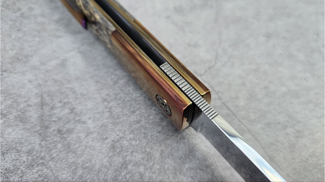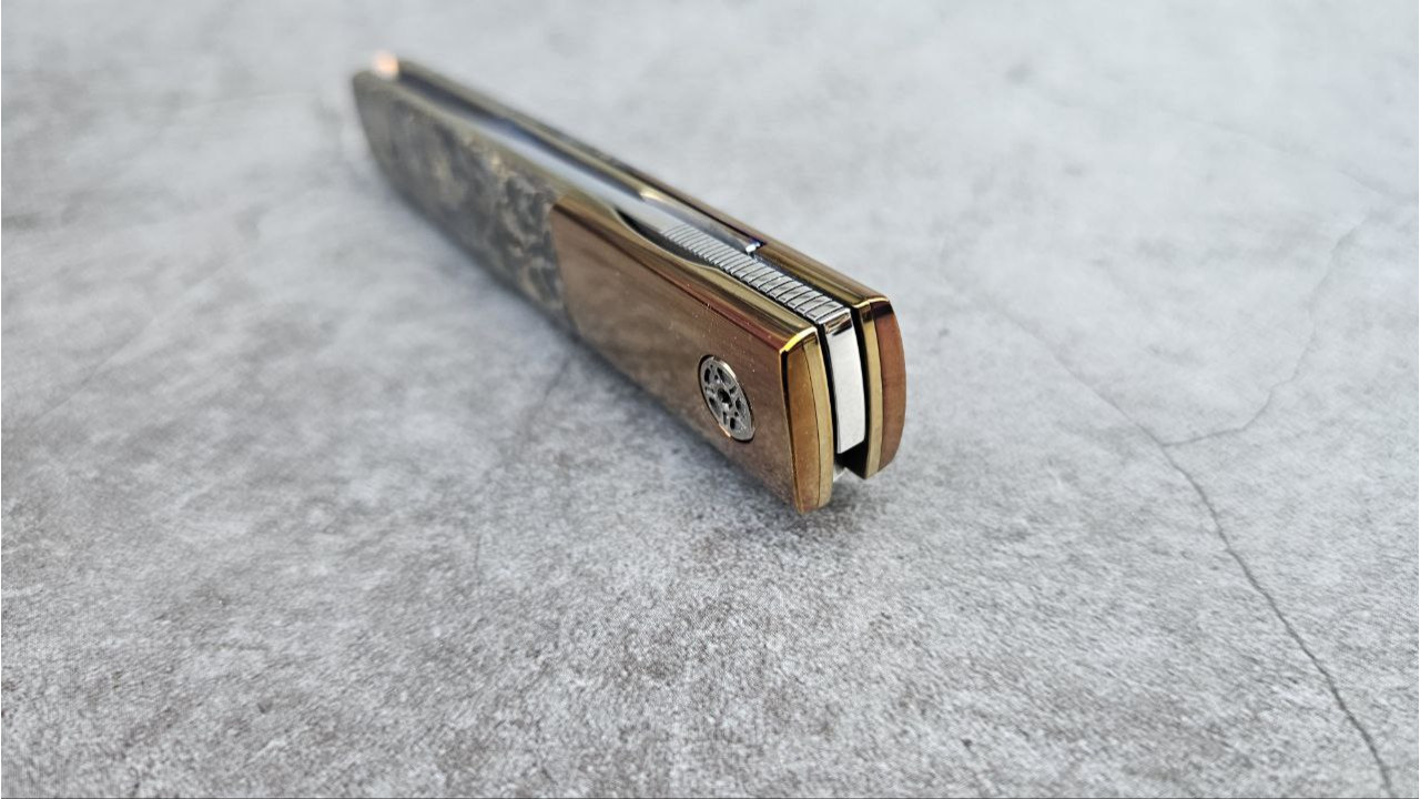 | Матеріал руків'я: | Притини: анодований титан. Накладки: карбон від Fat Carbon Dark Matter Gold. Лайнера: титан. Осьовий підшипник: керамічний. Шарик детента: керамічний. Сухарик: загартована сталь N690. Кліпса: титан. |