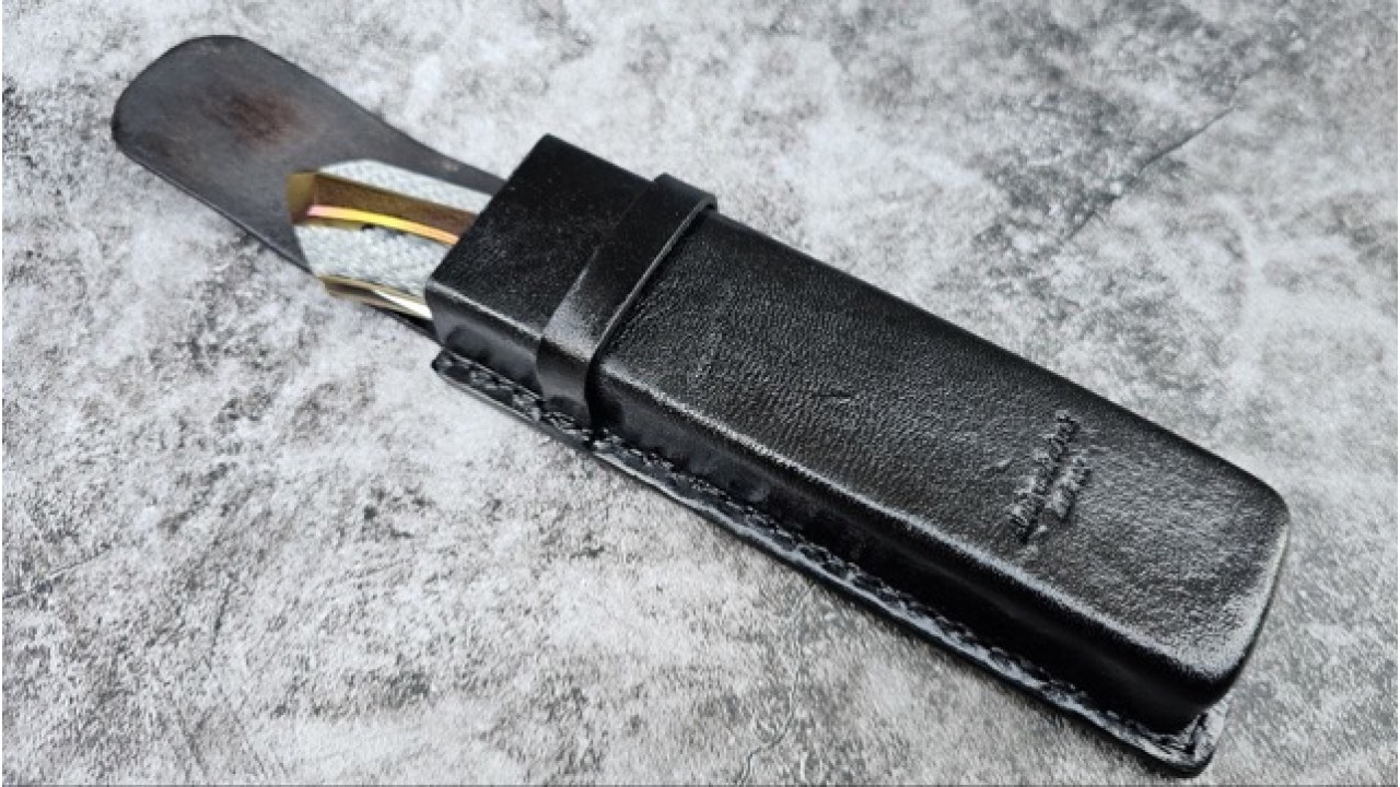 Піхви: Італійська натуральна теляча шкіра чепрак рослинного вичинки та дублення 4.0 мм, оброблена апретурою для захисту від води та просякнута захисними розчинами, прошита вручну вощеною ниткою. Ручне тиснення фактури