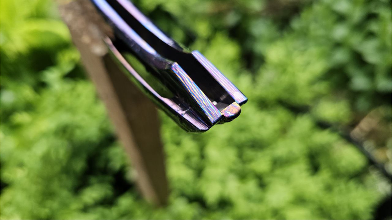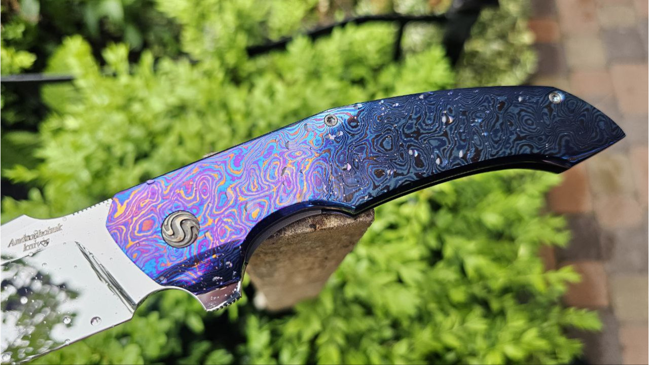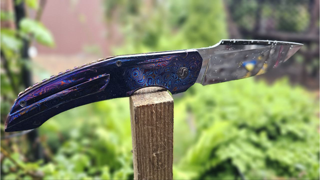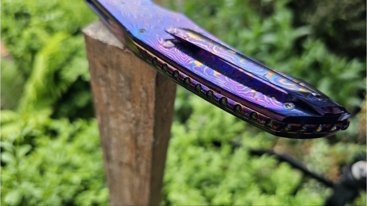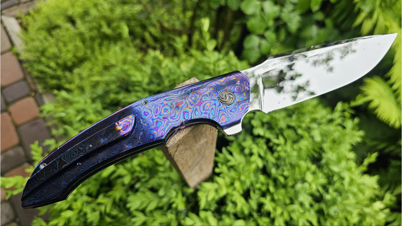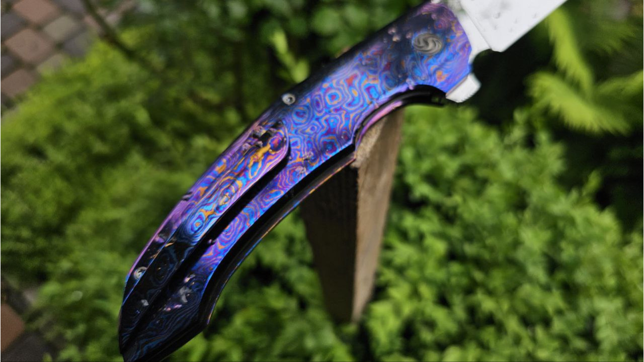 - Тімаскус – це, титановий Дамаск. Це композитний матеріал, створений шляхом зварювання різних сплавів титану, що надає йому унікальні візерунки, схожі на дамаську сталь, але з легкістю та корозійною стійкістю титану.